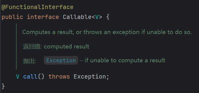 可以看到Callable接口中只有一个call()方法,是不是感到有些熟悉,我们之前学习Runnable接口的时候提到过,Runnable接口中只有一个run()方法,我们称这种只有一个方法的接口为函数式接口,可以使用lambda表达式简化表达