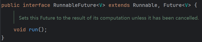 可以看到FutureTask类接入了RunnableFuture接口,这个接口又是继承了Runnable接口的,这意味着FutureTask有着可被线程执行的特性,也就是可以直接提交给Thread执行。