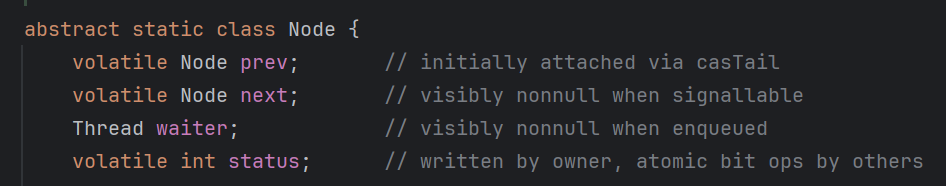 AQS 的抽象 Node 类,定义了节点的前驱 / 后继指针(prev/next)、等待线程(waiter)和节点状态(status)
