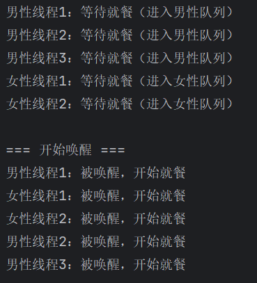 结果正确,我们正确让男生进入男生队列,女生进入女生队列,最后唤醒的时候也是针对性的唤醒不同性别的线程
