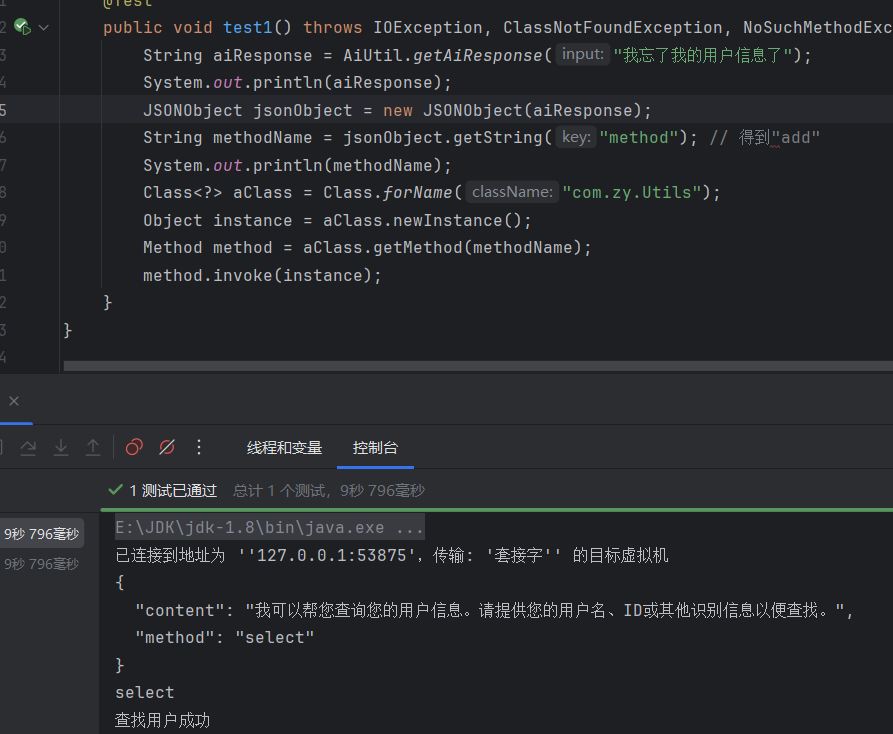 public class Test01 {@Testpublic void test1() throws IOException, ClassNotFoundException, NoSuchMethodException, InstantiationException, IllegalAccessException, InvocationTargetException {String aiResponse = AiUtil.getAiResponse("我忘了我的用户信息了");System.out.println(aiResponse);JSONObject jsonObject = new JSONObject(aiResponse);String methodName = jsonObject.getString("method"); // 得到"add"System.out.println(methodName);Class<?> aClass = Class.forName("com.zy.Utils");Object instance = aClass.newInstance();Method method = aClass.getMethod(methodName);method.invoke(instance);}