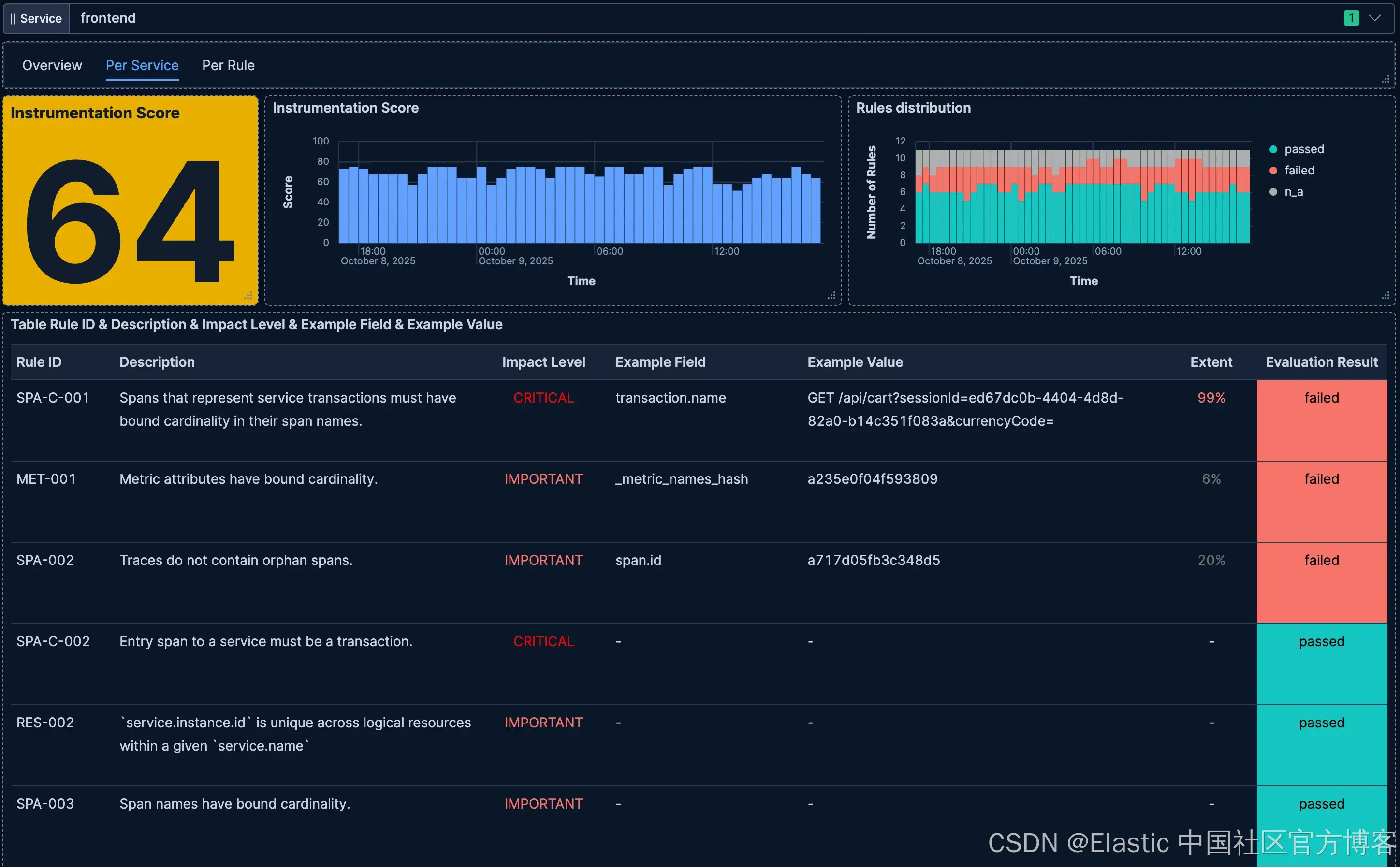 将结果存储在专用 Elasticsearch 索引后,我们可以构建仪表板来可视化 Instrumentation Score 洞察,并让用户排查数据质量问题。