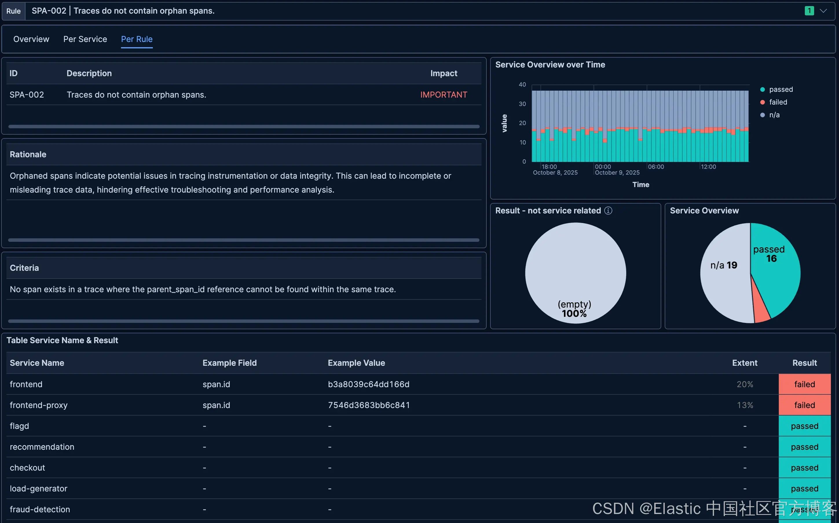 除了规则的元信息,如描述、理由和标准外,我们在右侧还能看到一些统计信息。例如,我们看到有 2 个服务未通过该规则,16 个通过,19 个服务该规则不适用(例如,这些服务没有 tracing 数据)。在下方的表格中,我们看到受到该规则违规影响的两个服务:frontend 和 frontend-proxy 服务。对于每个服务,我们还可以看到违规的程度。以 frontend 服务为例,大约 20% 的 traces 存在孤立 spans。这条信息非常关键,因为它表明规则违规的严重程度。如果低于 1%,问题可能可以忽略,但五条 traces 中有一条损坏,则必须修复。此外,对于每个服务,我们都有一个示例 span.id,其对应的 span 在其他 spans 的 parent.id 中被引用,但找不到实际的 span。这使我们能够对具体示例进行进一步分析(例如,通过 Kibana 的 Discover 调查引用的 spans)。