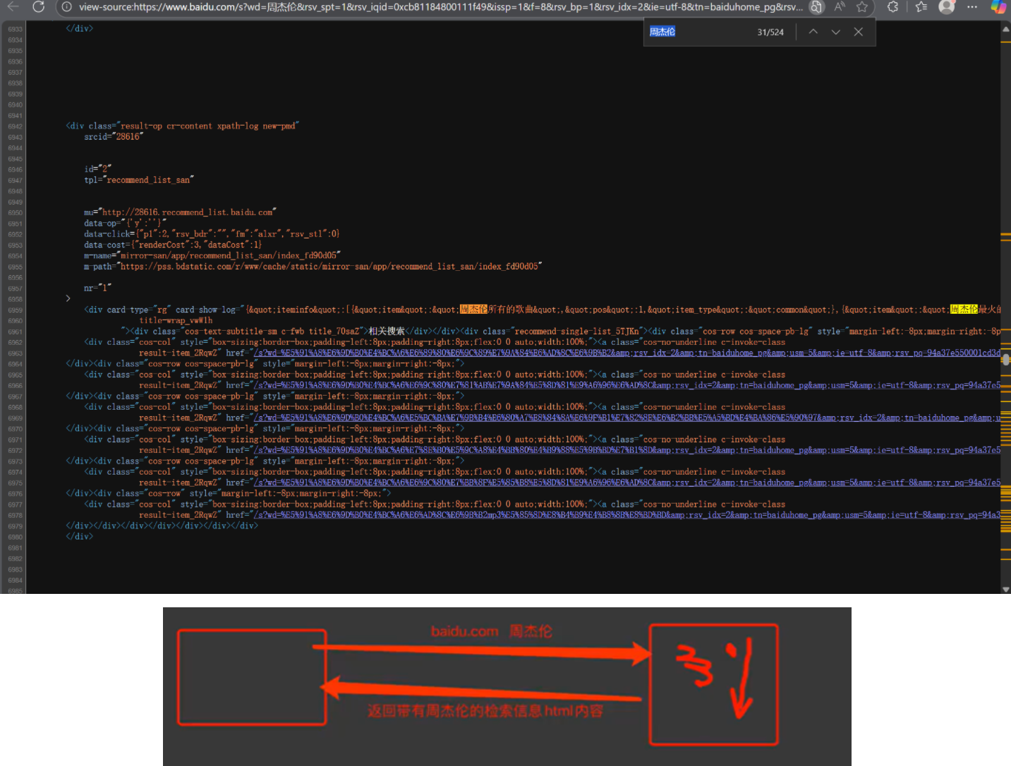 字节流里的内容(去掉 b 和引号后)是百度首页的 HTML 源代码,包含网页的结构和内容,核心元素包括: