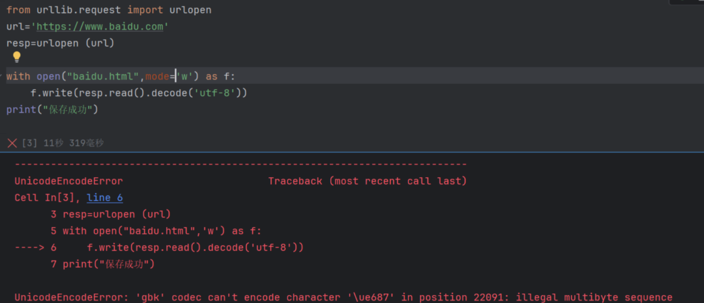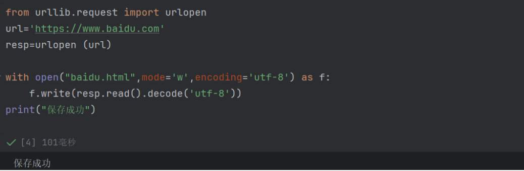 with open("baidu.html", mode='w', encoding='utf-8') as f:f.write(resp.read().decode('utf-8'))