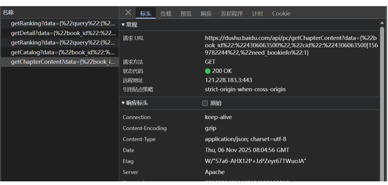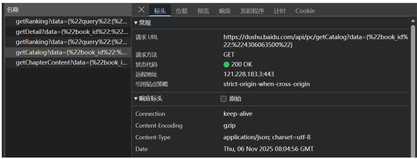 使用浏览器的抓包工具查看,发现这个 URL 是页面加载过程中发起的数据接口请求(属于客户端渲染的动态数据来源),也就是要数据这一步的关键