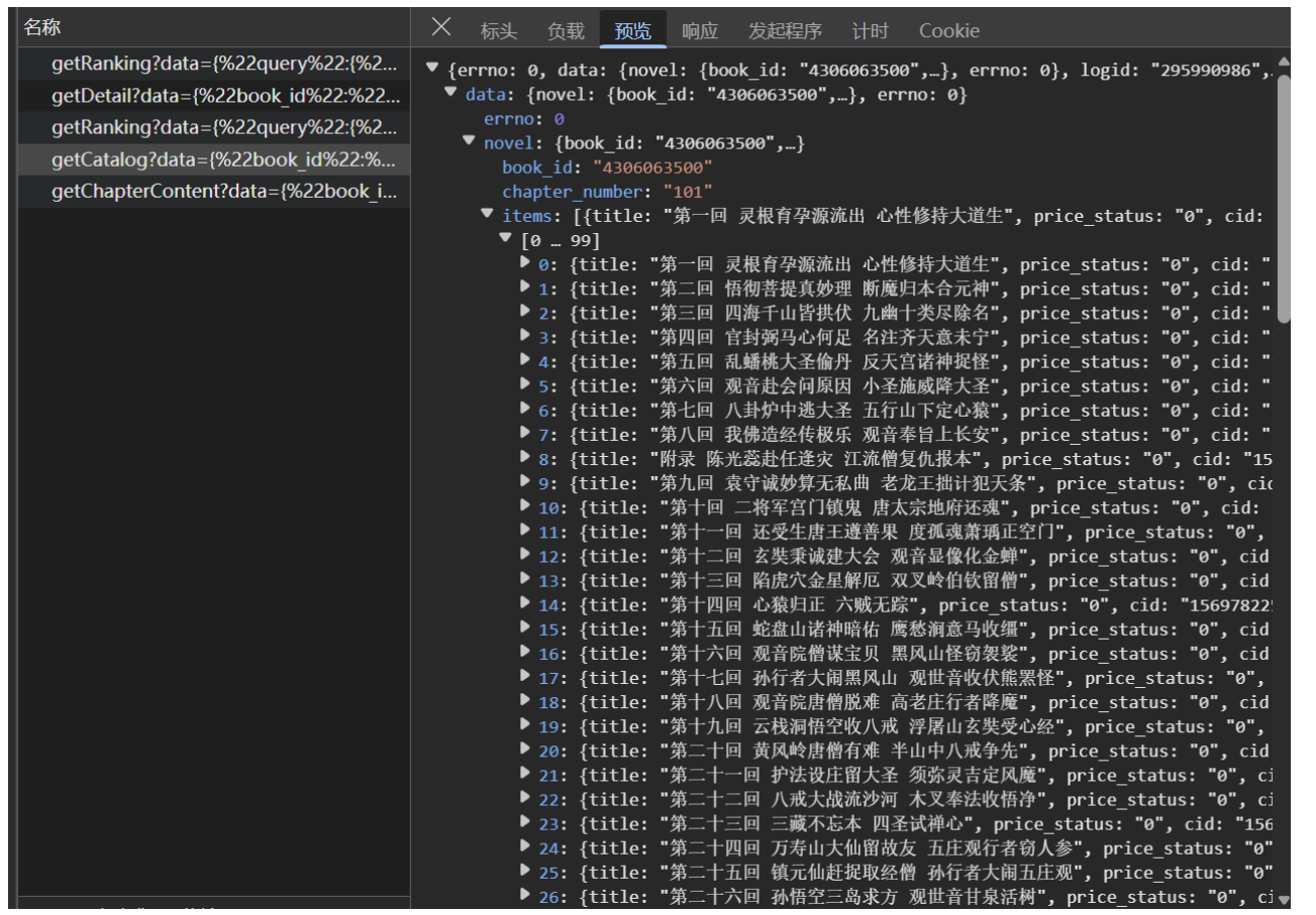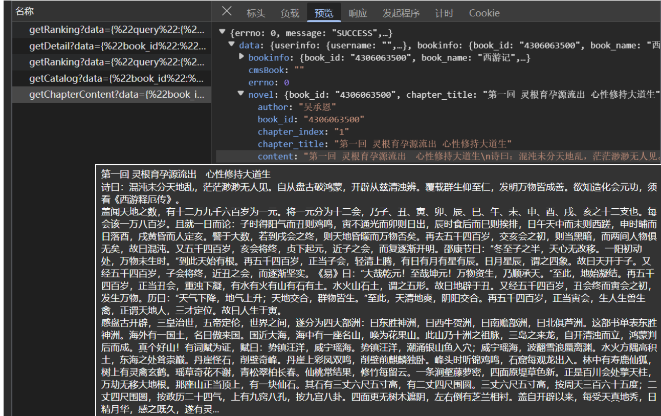一、找取内容加载的js异步接口,然后会发现这是其中一章的内容,id=1569782244,所以需要去找齐所有章节的id