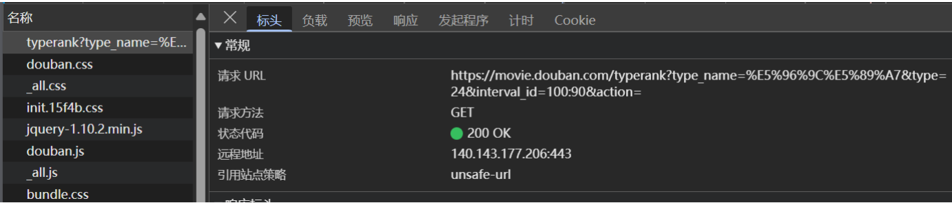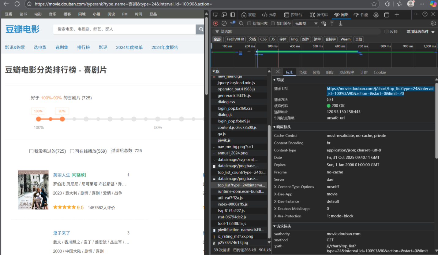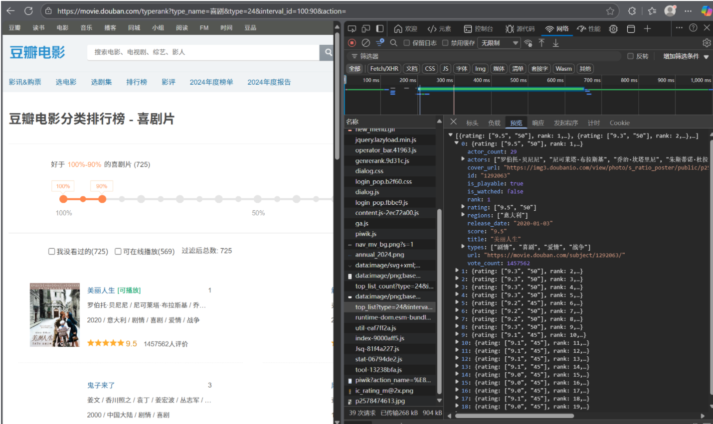 右侧 “预览” 面板中的内容,就是这个数据请求返回的原始数据格式(JSON),它和页面左侧显示的 “喜剧片排行榜” 内容完全对应。