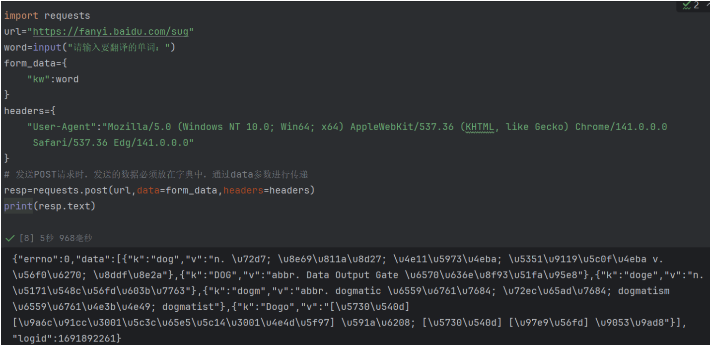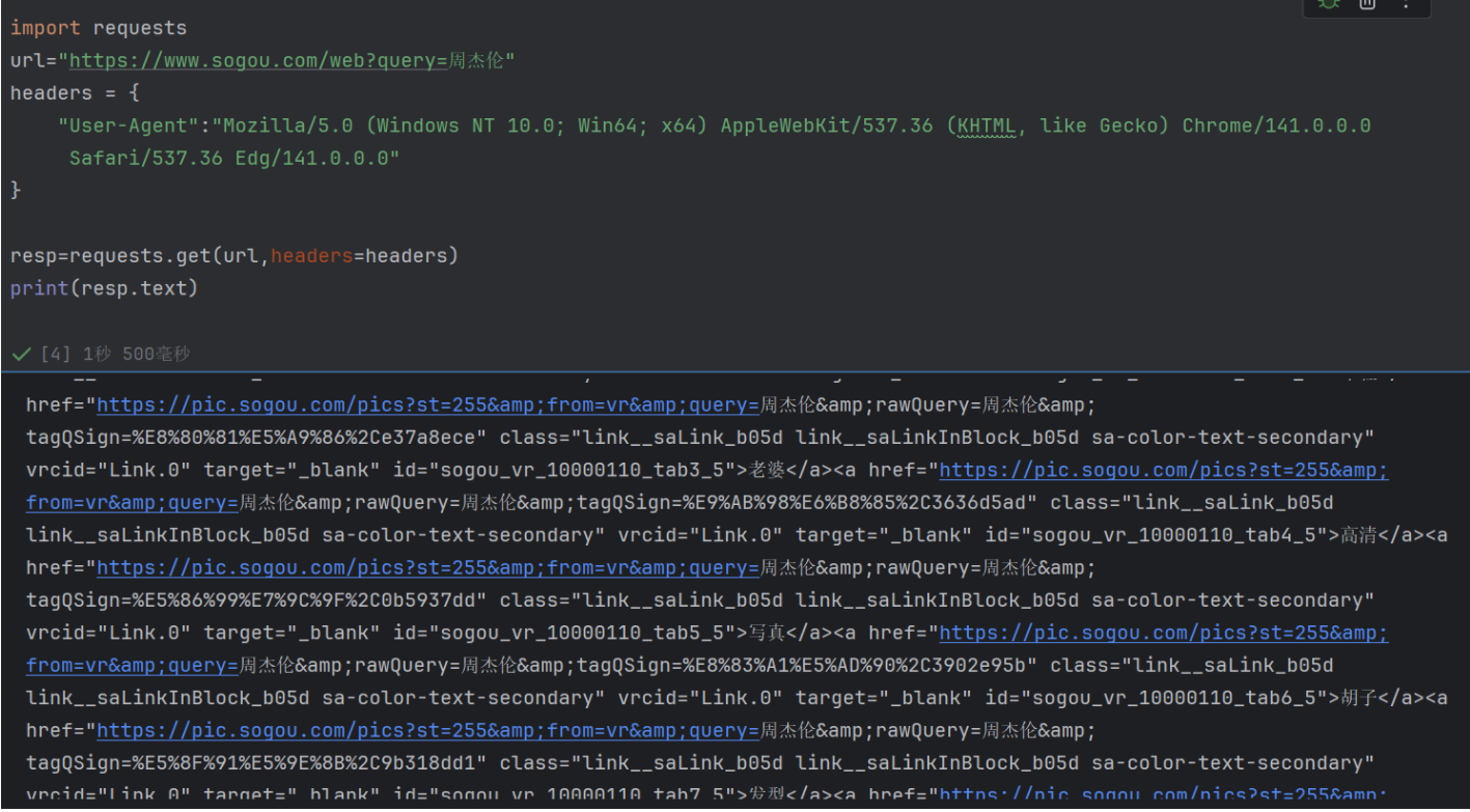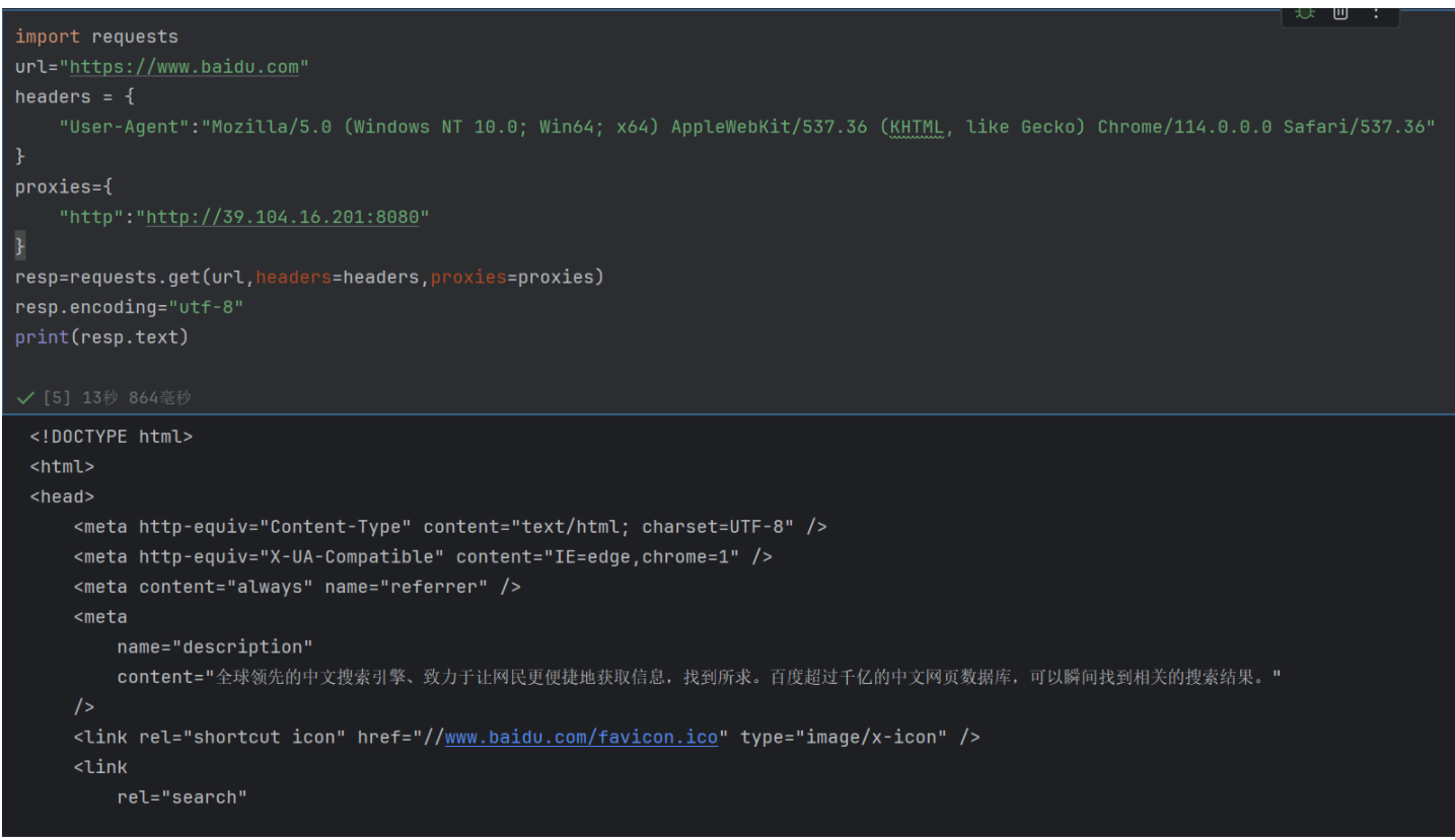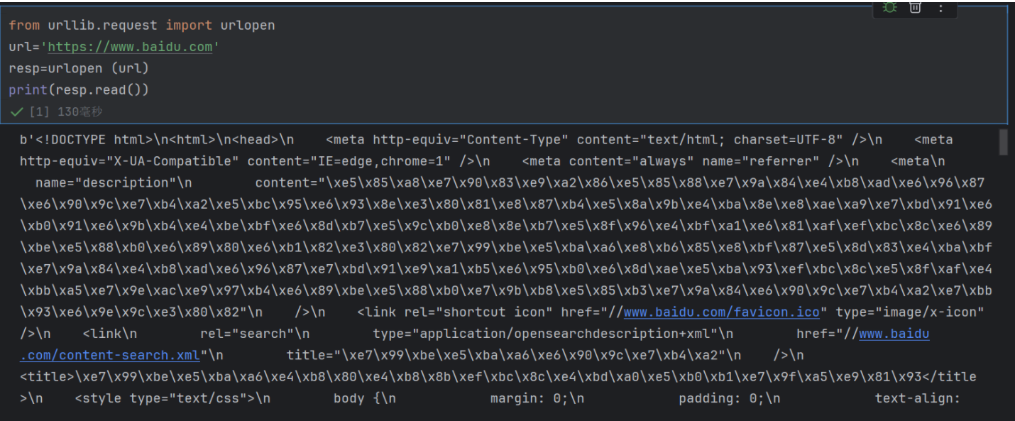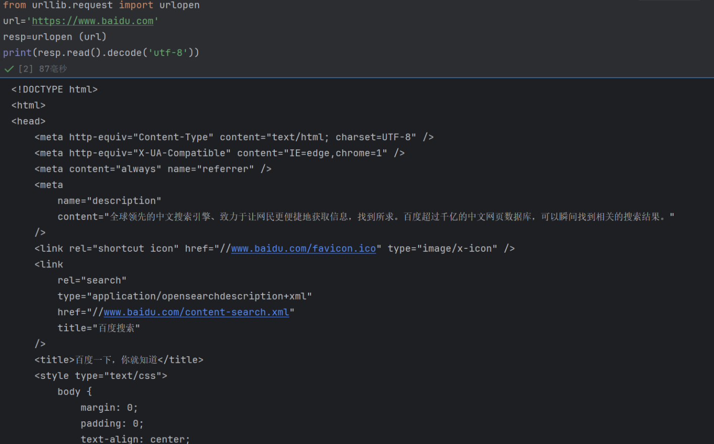 这段代码读取的就是百度首页的前端源代码,包括 HTML 结构、CSS 样式、JavaScript 脚本等浏览器渲染页面所需的 “原始素材”。