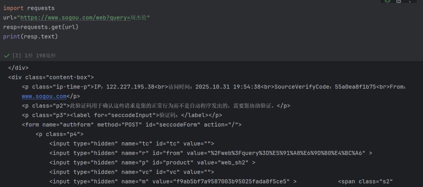 这个运行结果是爬虫入门的 “里程碑式验证”—— 它证明你已经掌握了 “发送 HTTP 请求→获取响应→解码内容” 的核心流程。接下来的学习方向可以是: