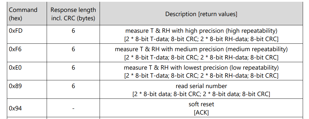 0xFD → 高精度温度湿度测量、0x89 → 读取32位唯一序列号、0x94 → 软件复位传感器