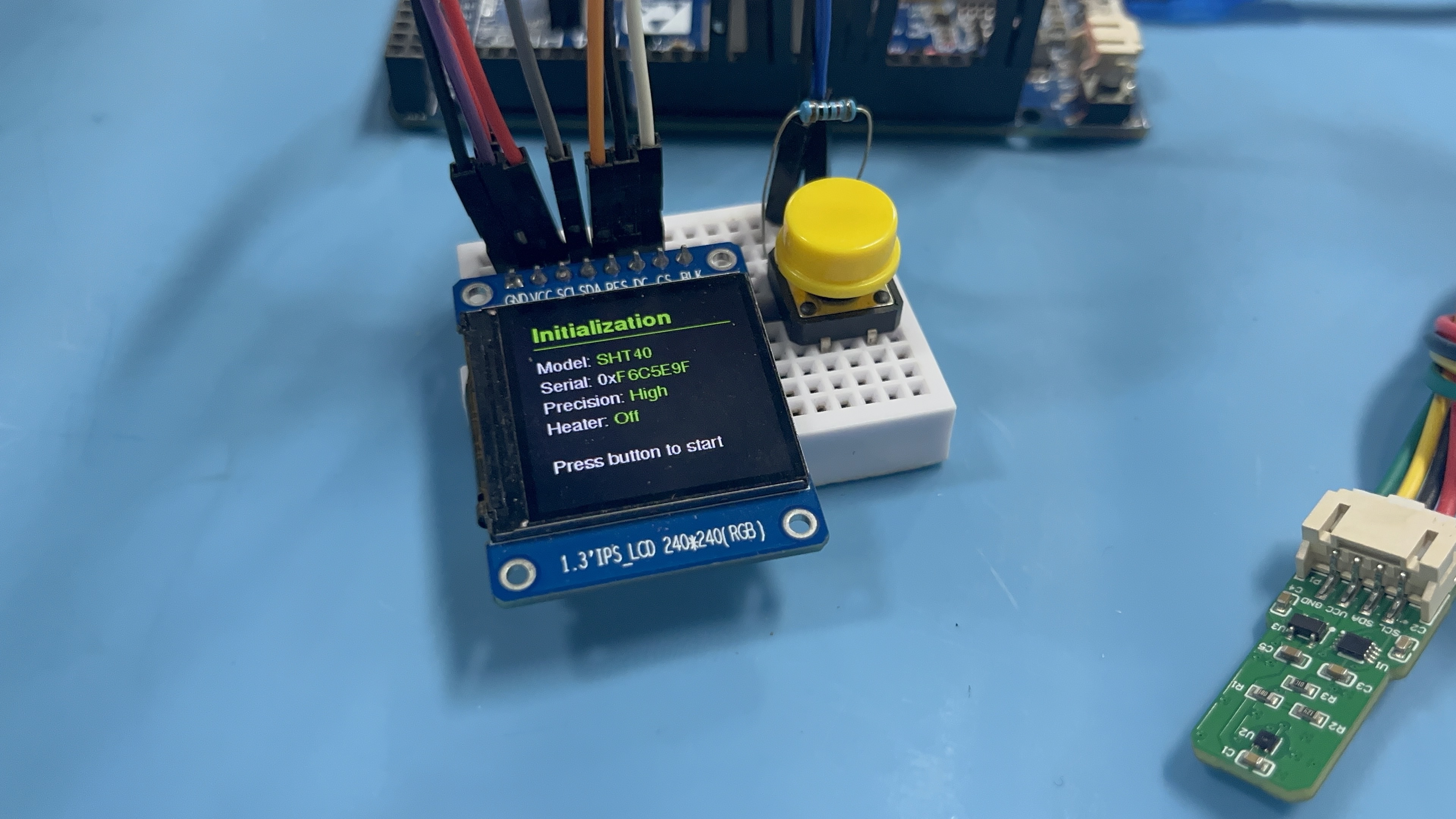 2)功能验证测试:确认序列号读取正确(每个传感器序列号不同)、按键切换四个显示界面、观察温湿度数据更新