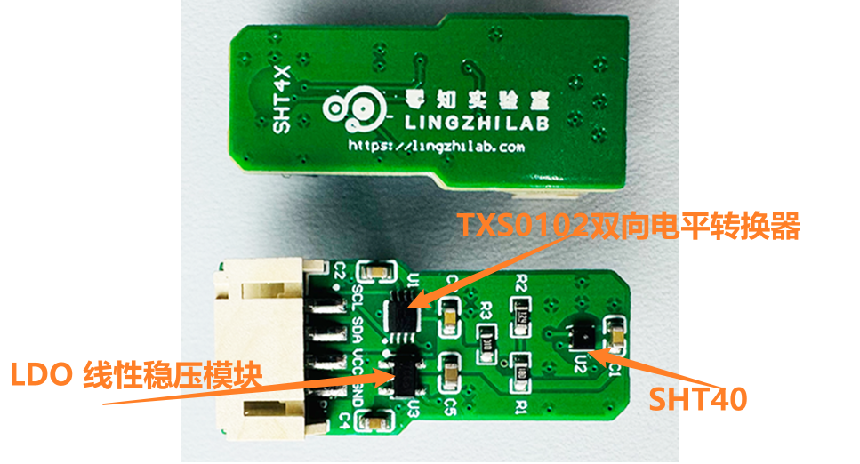 注意:零知SHT40温湿度传感器采用LDO模块适配增强板板载电源输入1.5V-5.5V宽电压,满足芯片1.08V-3.6V供电电压