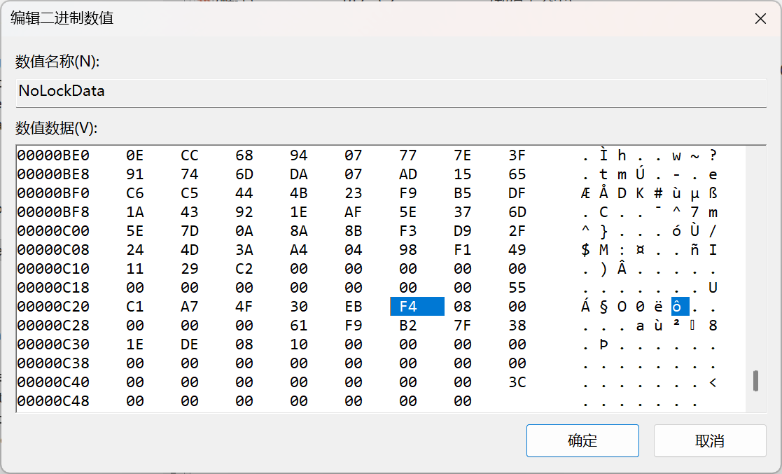 3.在右侧找到NoLockData,双击打开面板(里面的数据都是十六进制的)。