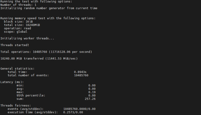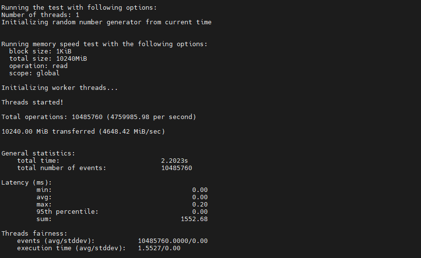 sysbench memory \--memory-block-size=1K \--memory-total-size=10G \--memory-oper=read \--memory-access-mode=seq \--threads=1 \run | tee results/memory/02-seq-read-1t.txt