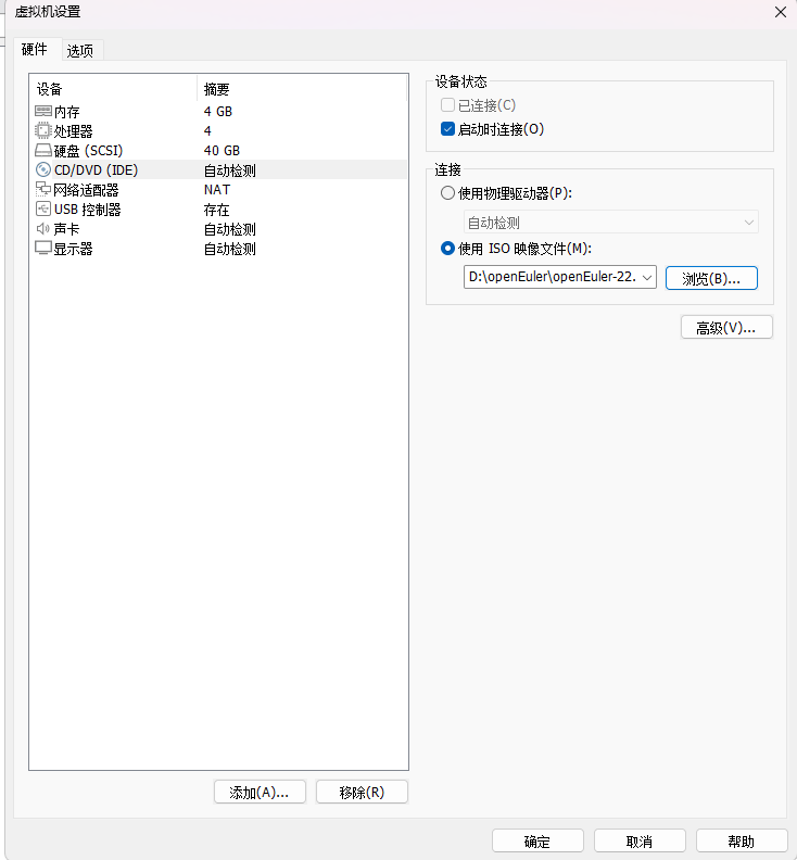 1. 选中创建的虚拟机 2. 右键 → 设置(或点击"编辑虚拟机设置") 3. 选择 CD/DVD (SATA) 4. 连接方式:使用ISO映像文件 5. 浏览选择:openEuler-22.03-LTS-x86_64-dvd.iso 6. 勾选"启动时连接" 7. 点击"确定"