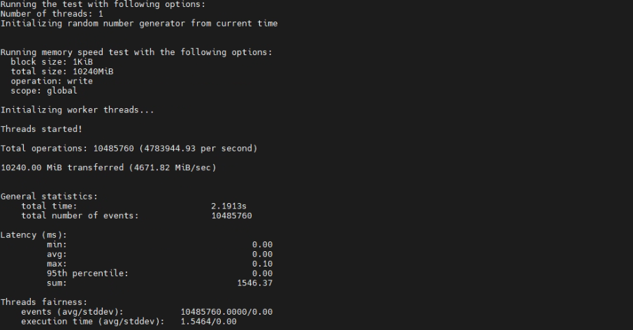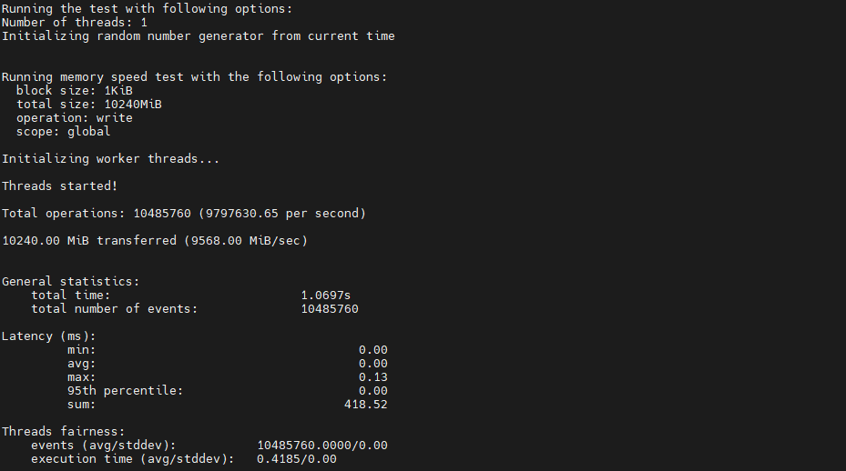 sysbench memory \--memory-block-size=1K \--memory-total-size=10G \--memory-oper=write \--memory-access-mode=seq \--threads=1 \run | tee results/memory/01-seq-write-1t.txt