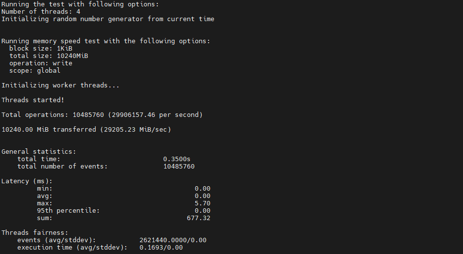 sysbench memory \--memory-block-size=1K \--memory-total-size=10G \--memory-oper=write \--memory-access-mode=seq \--threads=4 \run | tee results/memory/05-seq-write-4t.txt