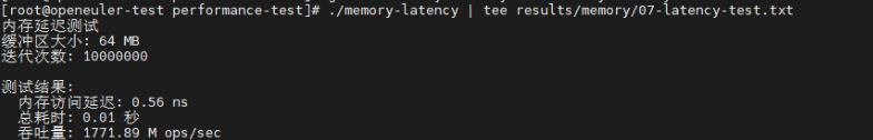 性能分析:在openEuler 22.03 LTS环境下,内存延迟仅0.56ns,吞吐量高,这得益于其对缓存行和时钟优化的支持。测试快速高效,适用于高精度应用。