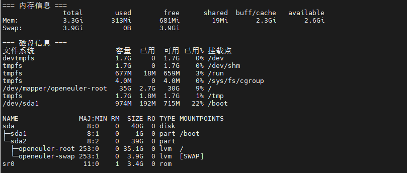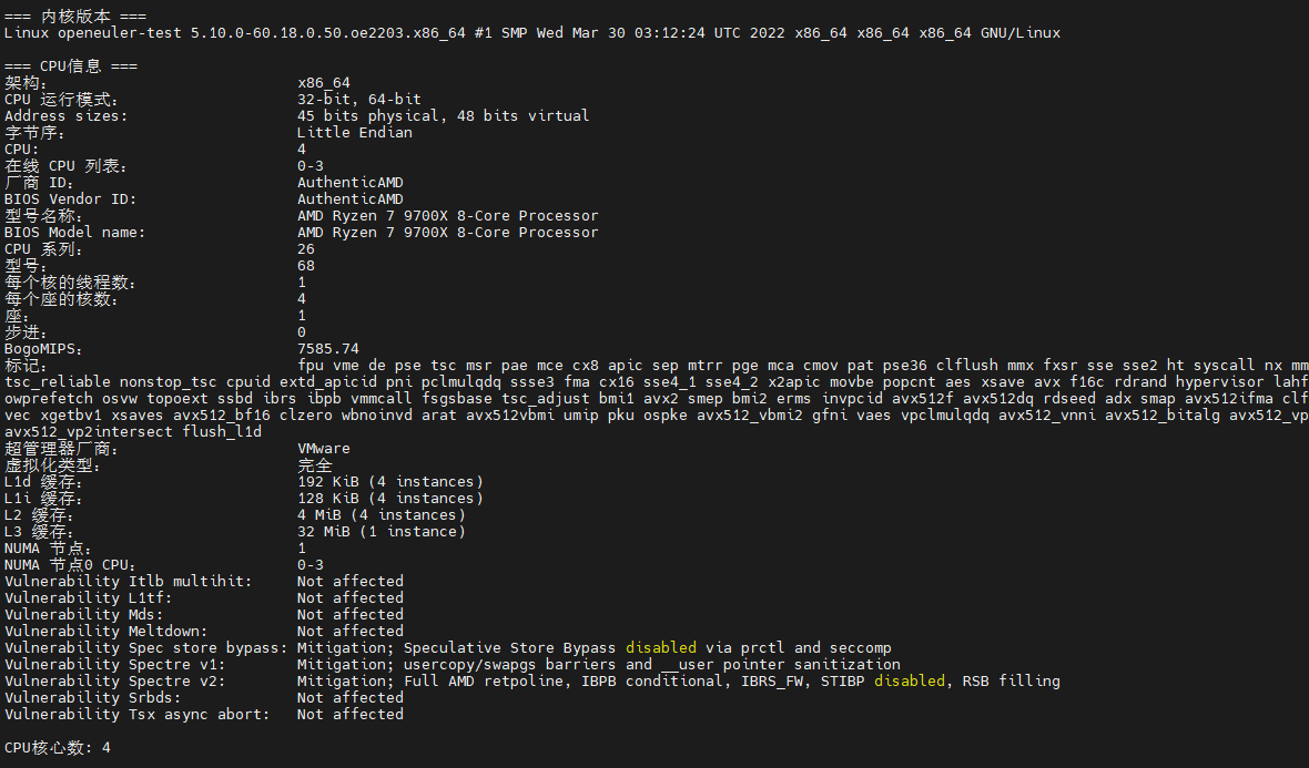 在VMware Workstation 17.x虚拟化平台上部署的openEuler 22.03 LTS系统(x86_64架构,4核心CPU、4GB内存、40GB硬盘、NAT网络),通过sysbench、stress等工具进行了CPU和内存基准测试。整体而言,openEuler 22.03 LTS展现出卓越的性能优化和稳定性,openEuler其内核调度、多核支持和资源管理机制在虚拟环境中的表现尤为突出,适用于服务器、云计算和边缘计算场景。