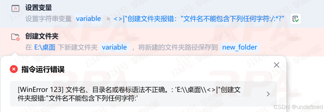在日常使用影刀RPA创建文件和文件夹时,很多人可能都遇到一类报错提示:“文件名不能包含下列任何字符:/:\*?"<>|”。