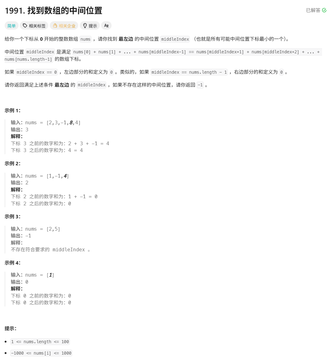 public:int findMiddleIndex(vector<int>& nums) {int total = 0;// 1. 先算数组总和(仅遍历1次,O(n))for (int i=0;i<nums.size();i++) total += nums[i];int suml = 0;// 2. 遍历每个mid,用公式算右和(O(n))for (int mid = 0; mid < nums.size(); mid++) {// 右和 = 总和 - 左和 - 当前mid的值int sumr = total - suml - nums[mid];if (suml == sumr) return mid;// 左和累加当前元素,为下一个mid做准备suml += nums[mid];}return -1;}