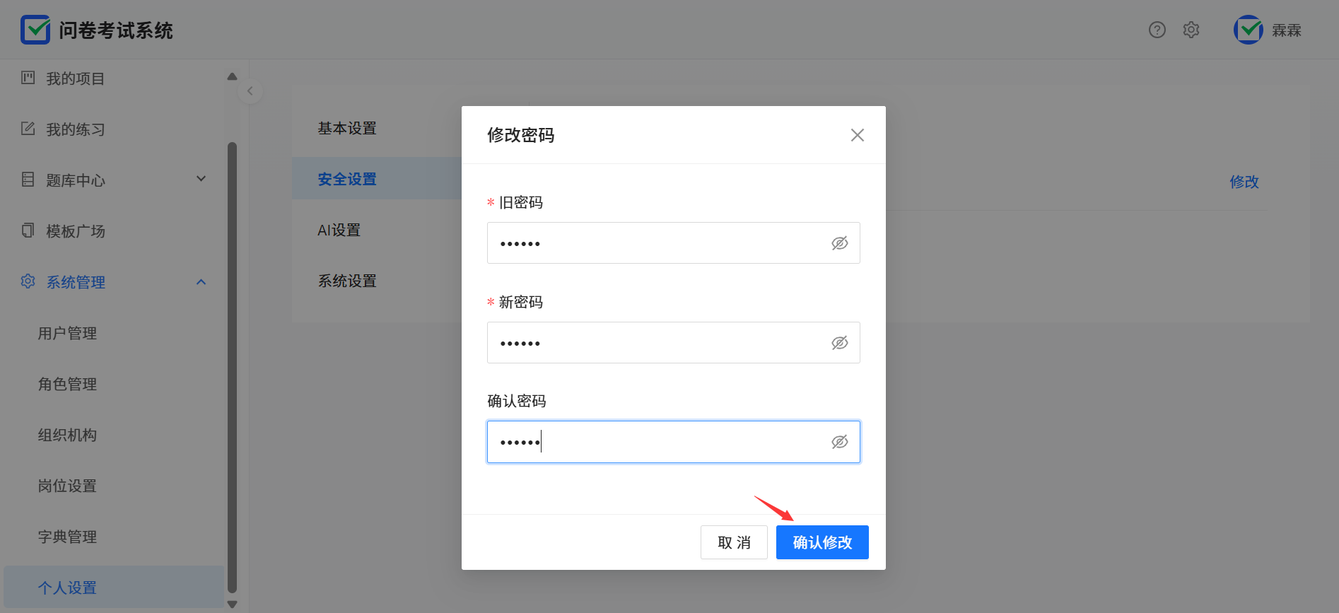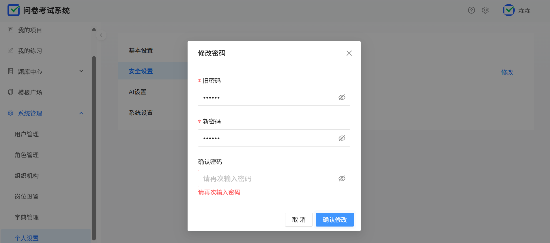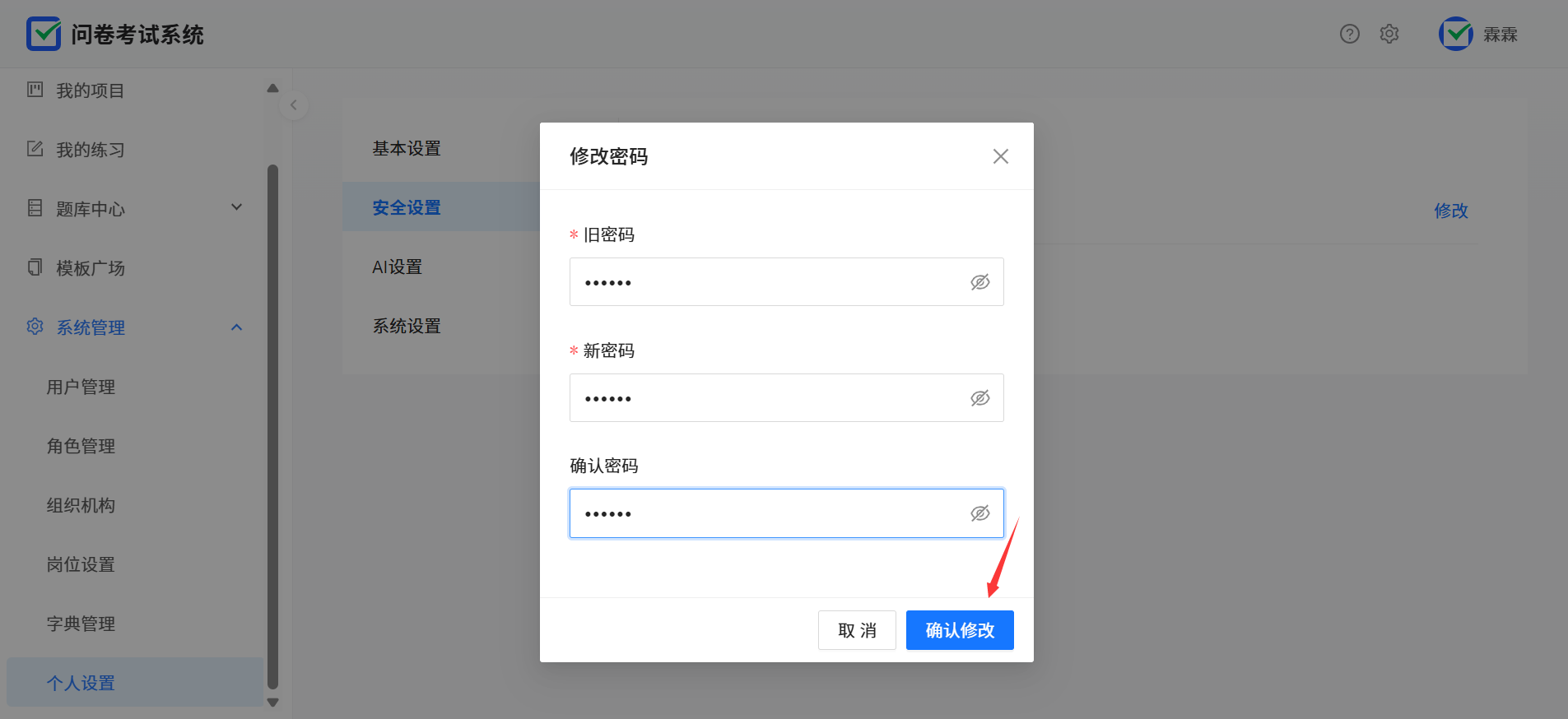 测试场景八:输入旧密码、新密码、确认新密码,点击“确认修改”按钮
