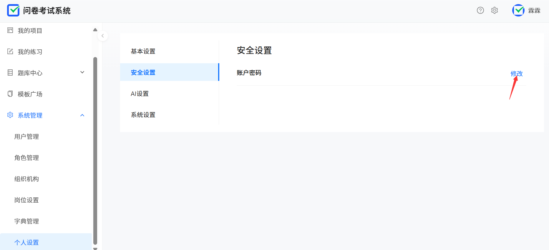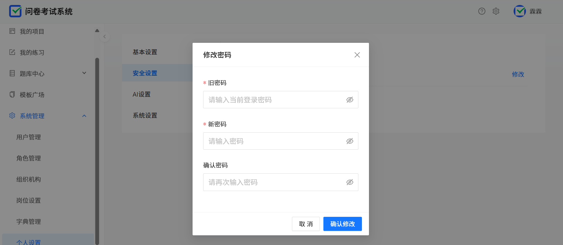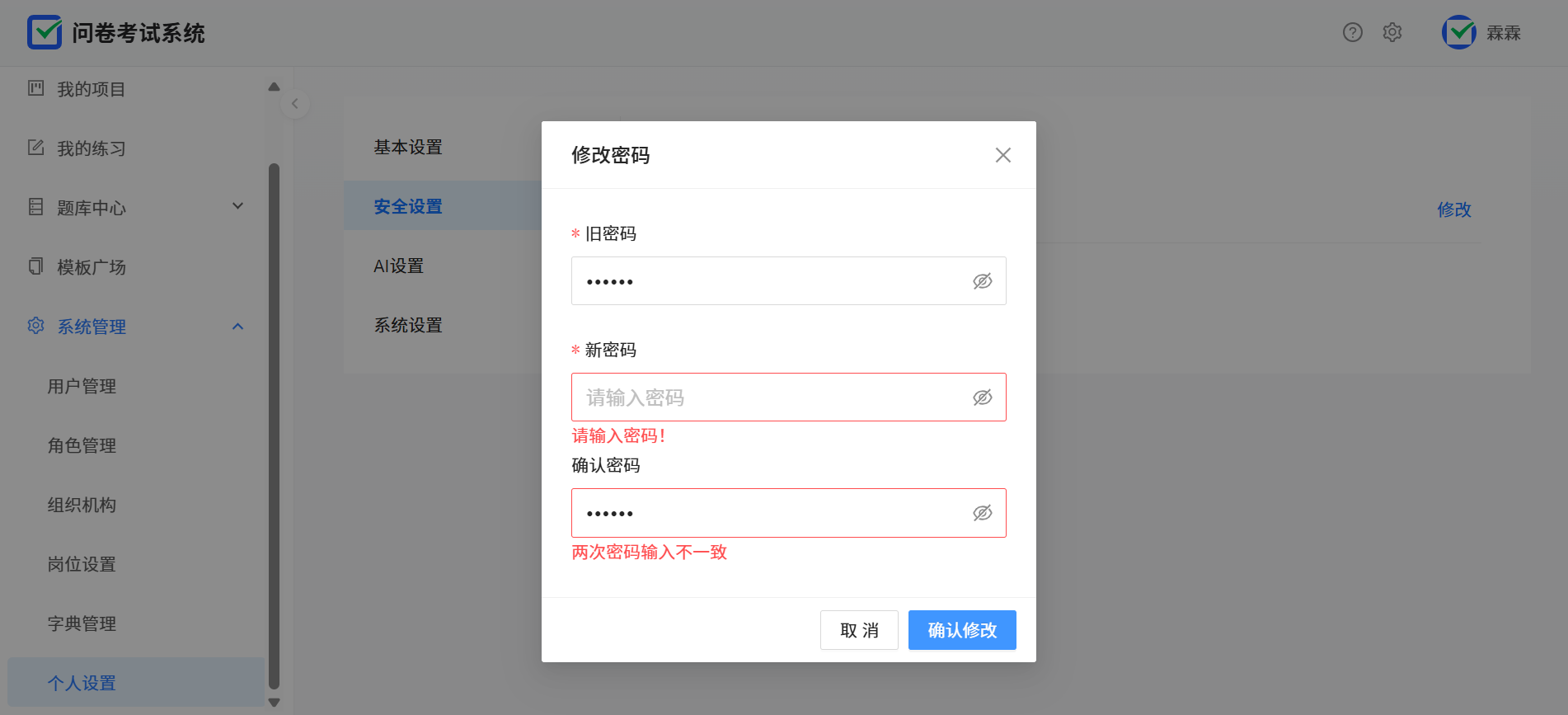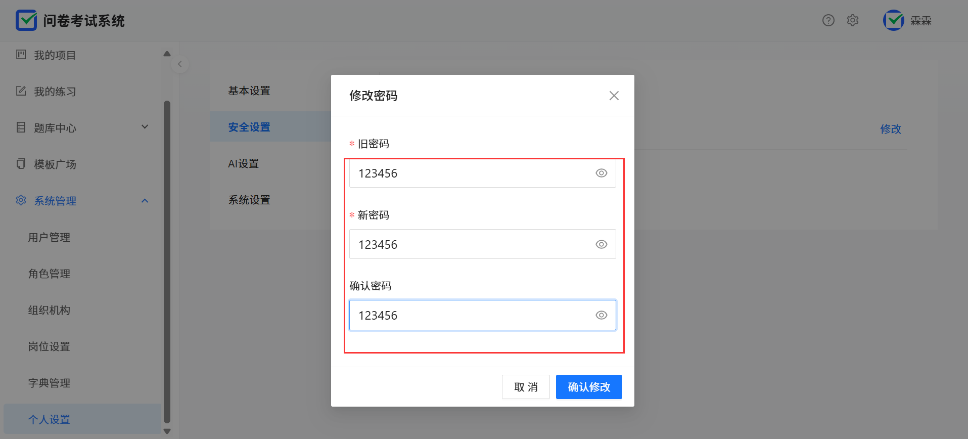 测试场景八:输入旧密码、新密码、确认新密码,点击“确认修改”按钮