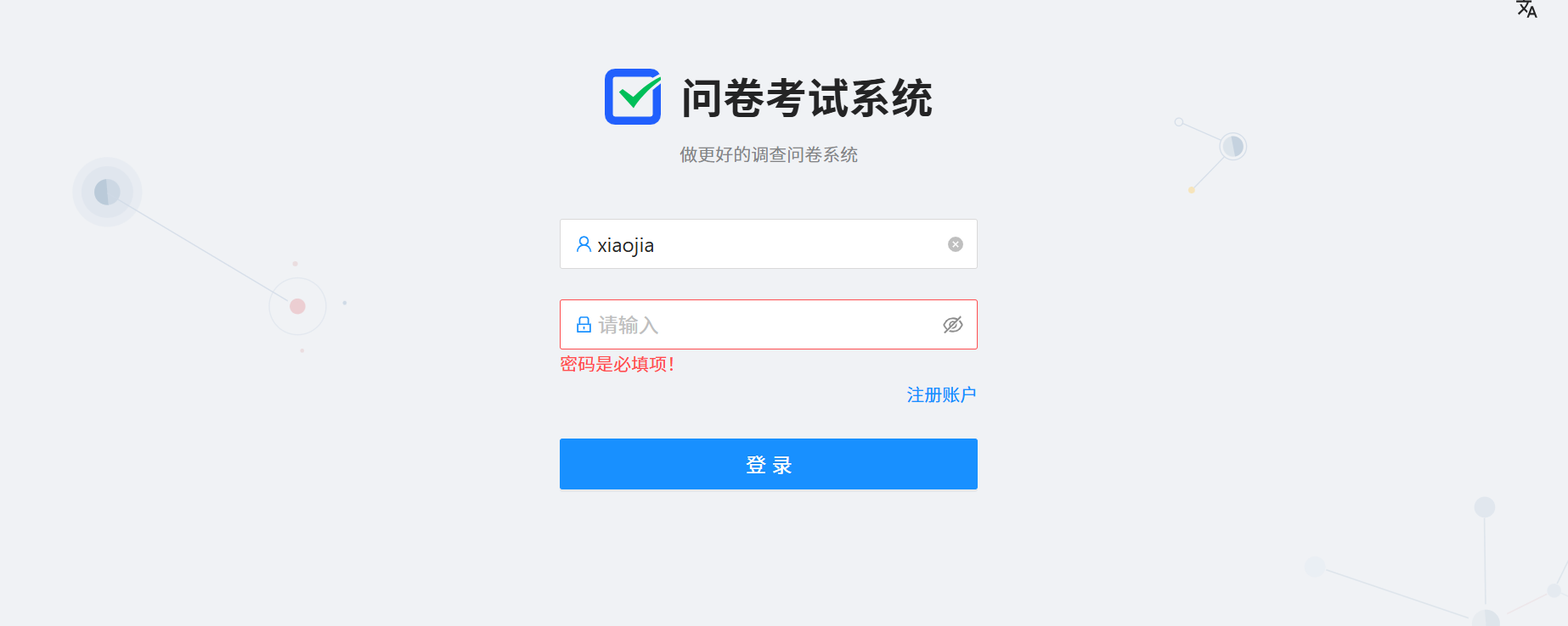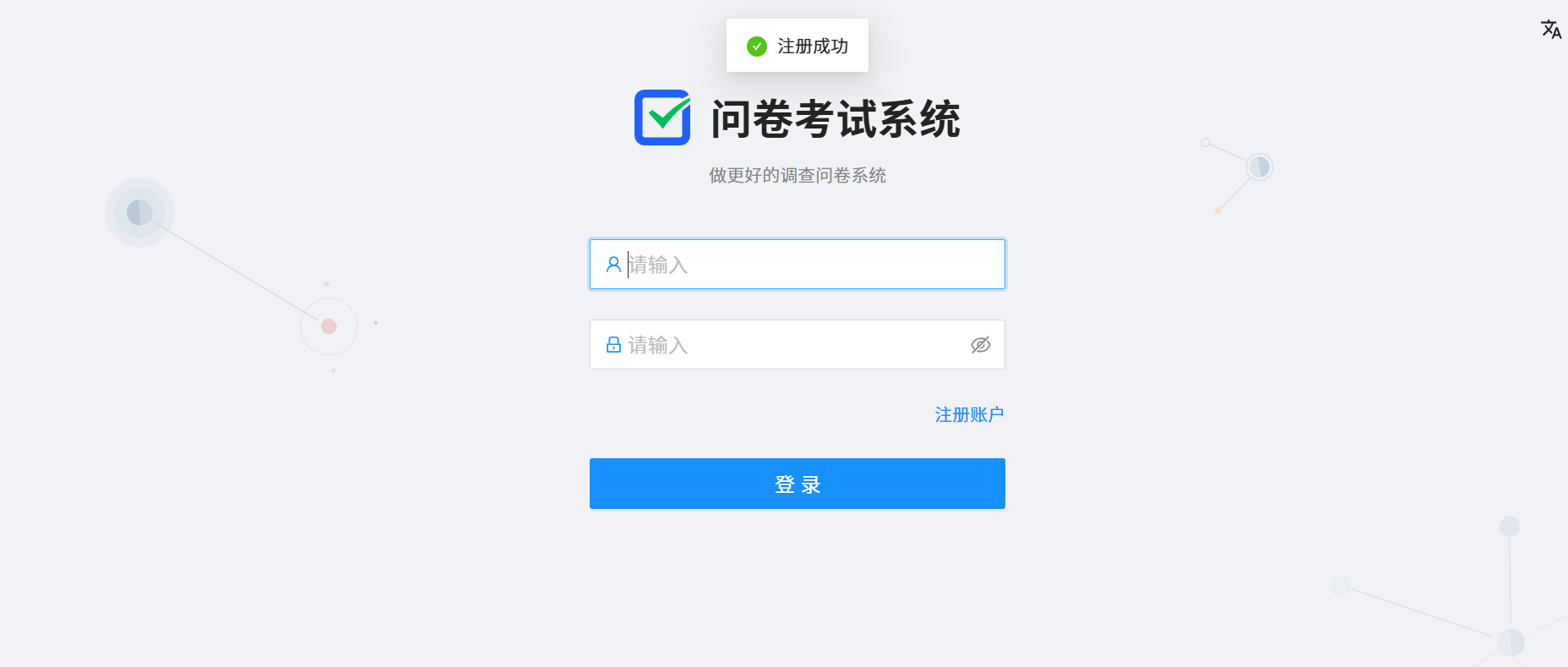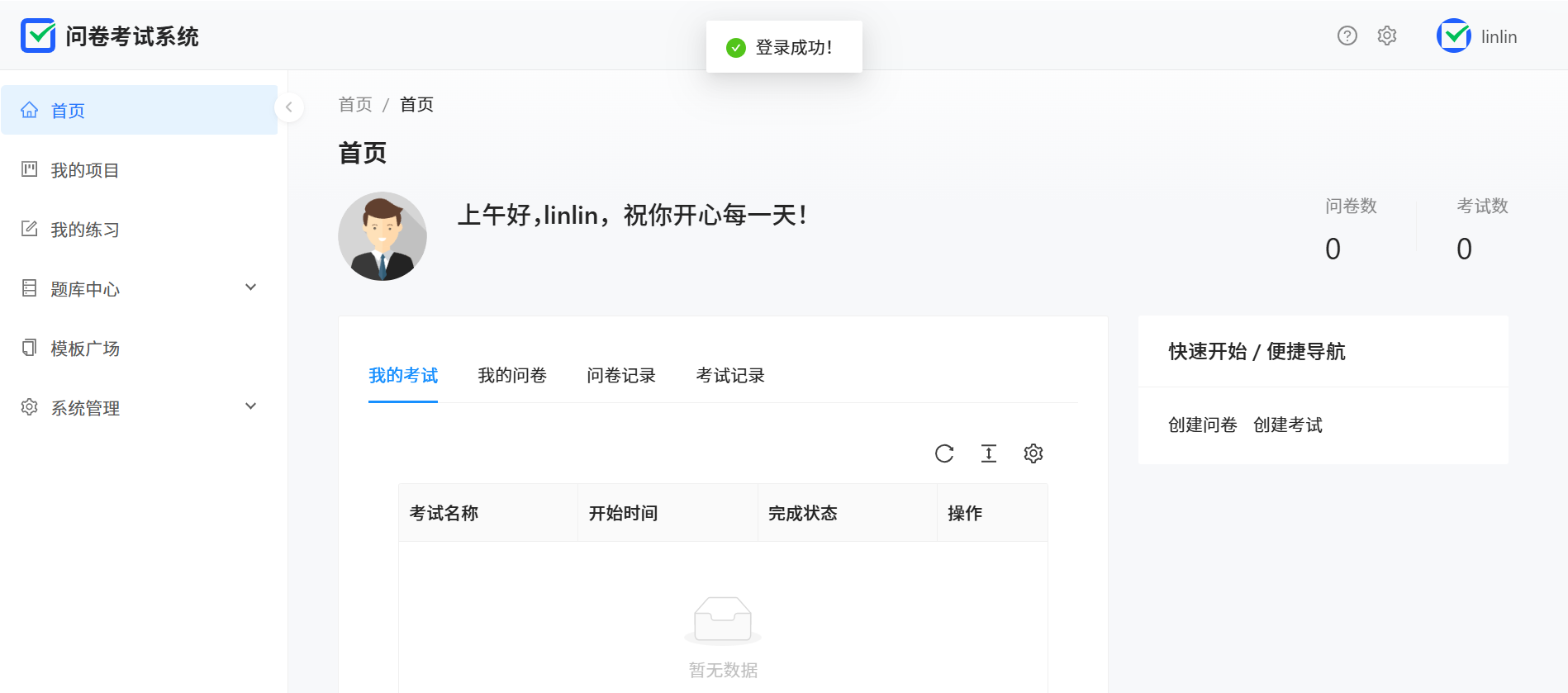 预期结果:显示登陆成功!跳转到问卷考试系统的首页页面