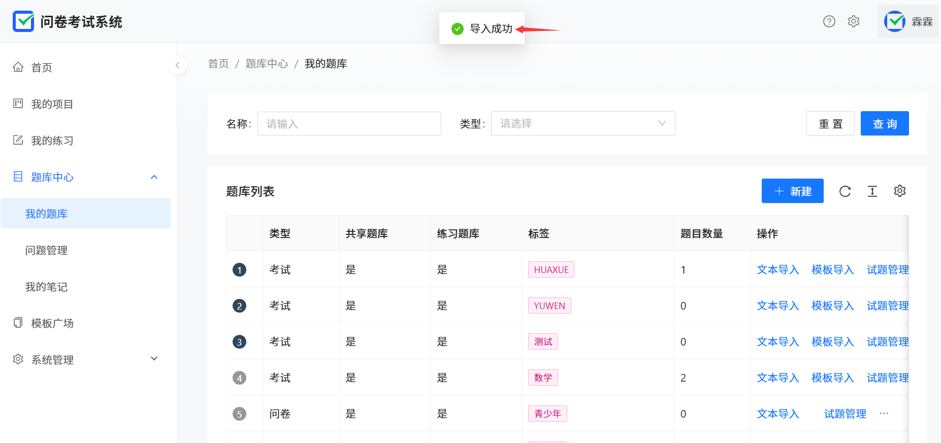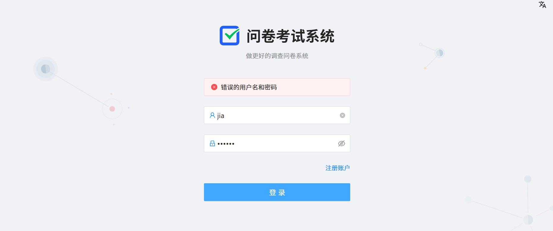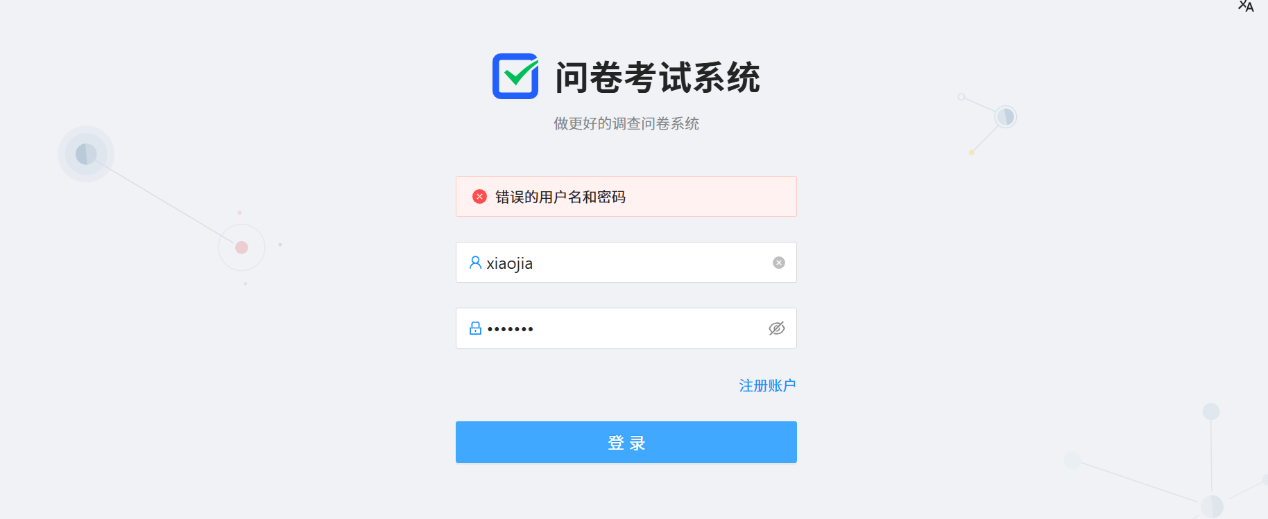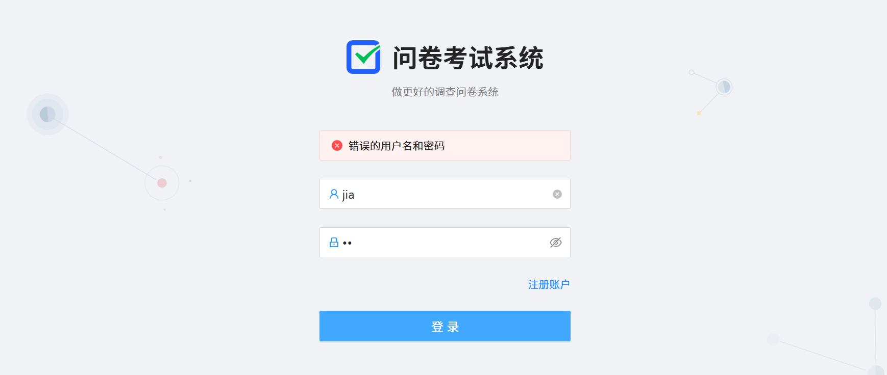 预期结果:显示登陆成功!跳转到问卷考试系统的首页页面
