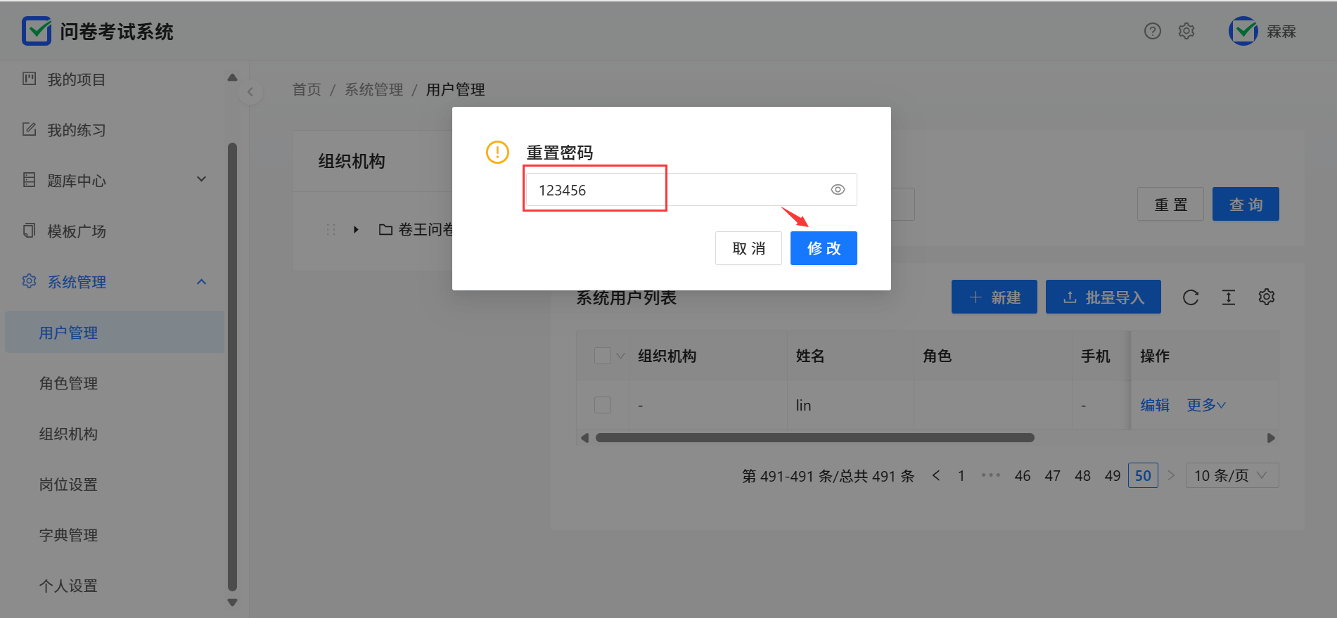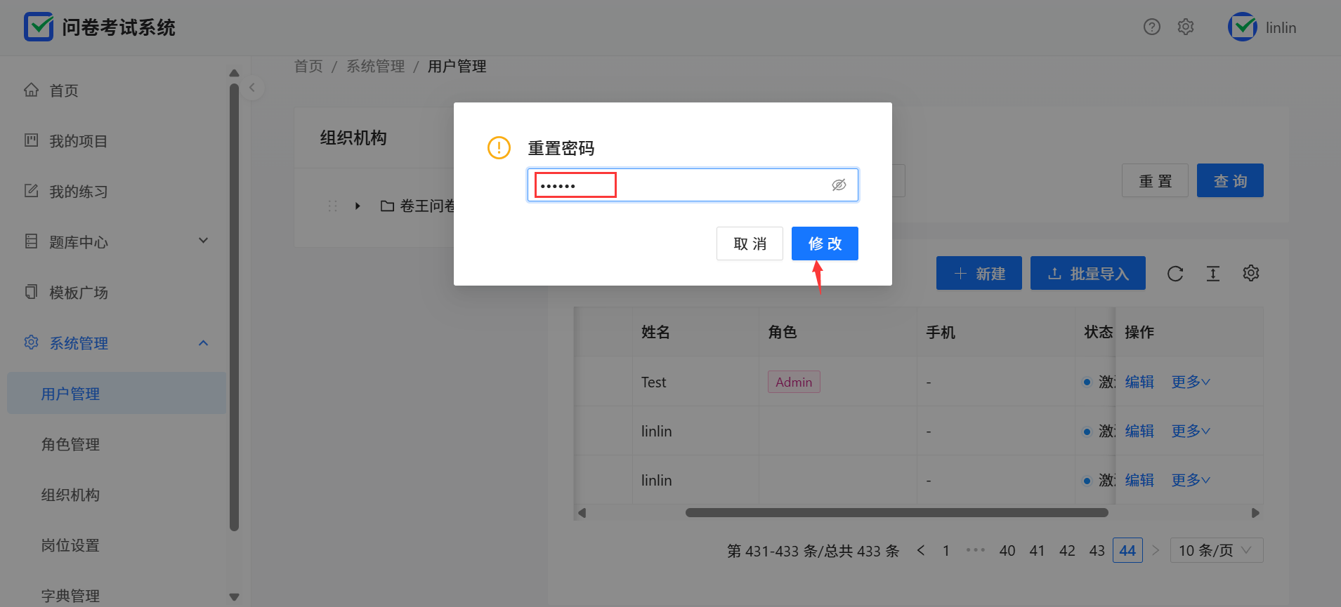 测试场景十一:点击“重置密码”按钮后,点击重置密码弹窗中的“修改”按钮