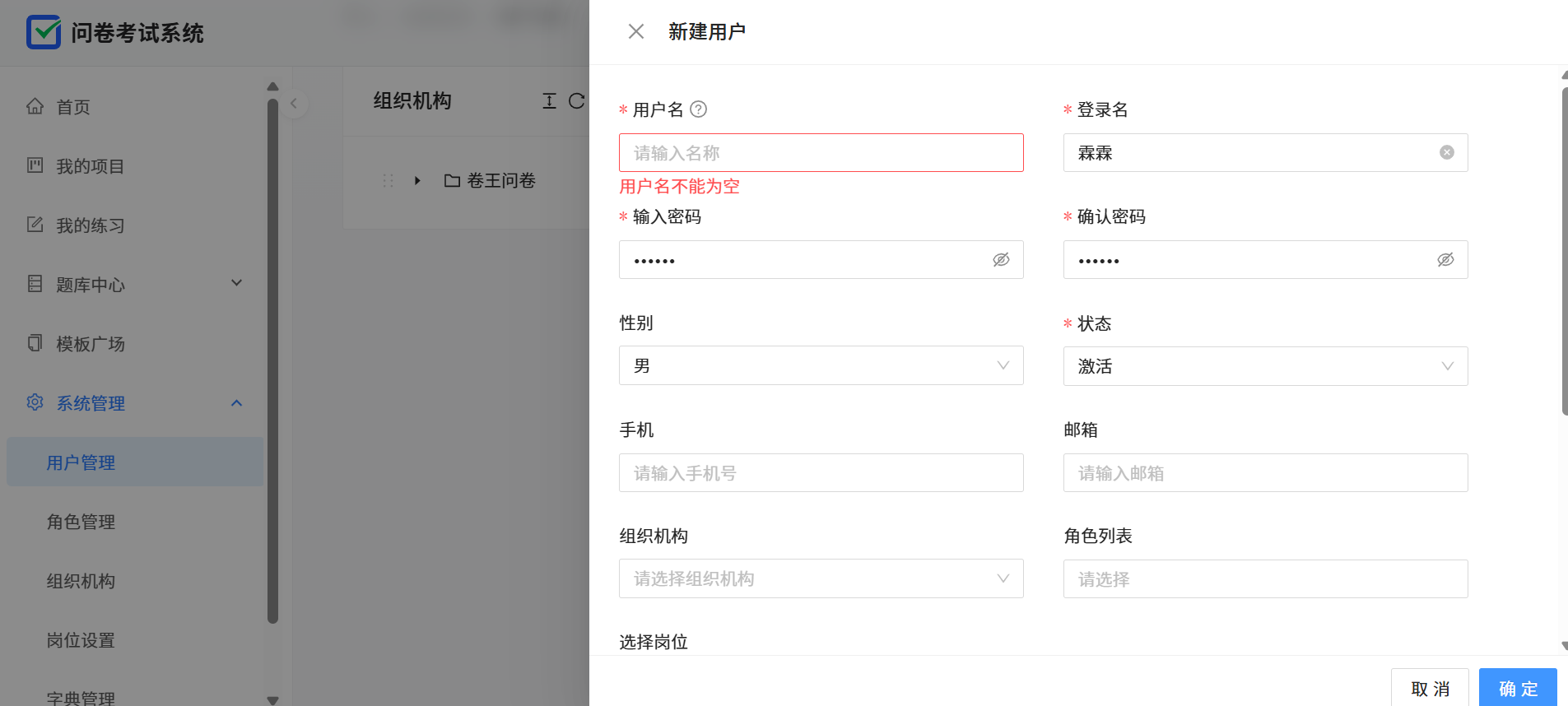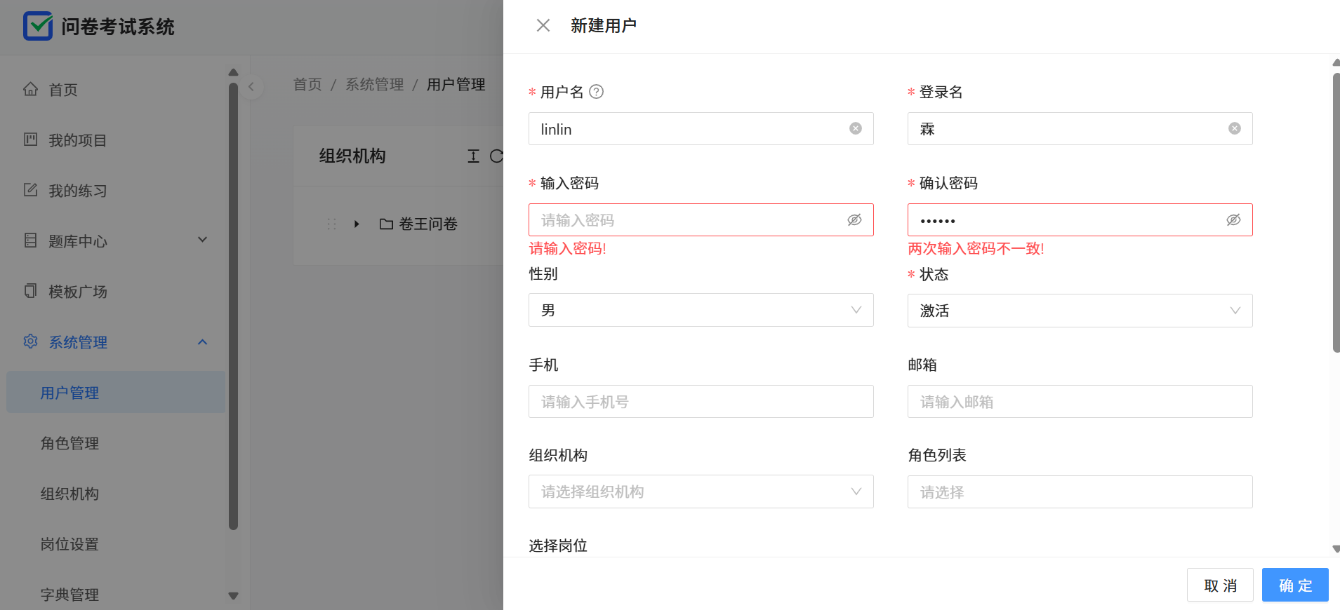 测试场景七:在新建用户弹窗中,输入密码为空,其他正常输入,点击“确定”按钮
