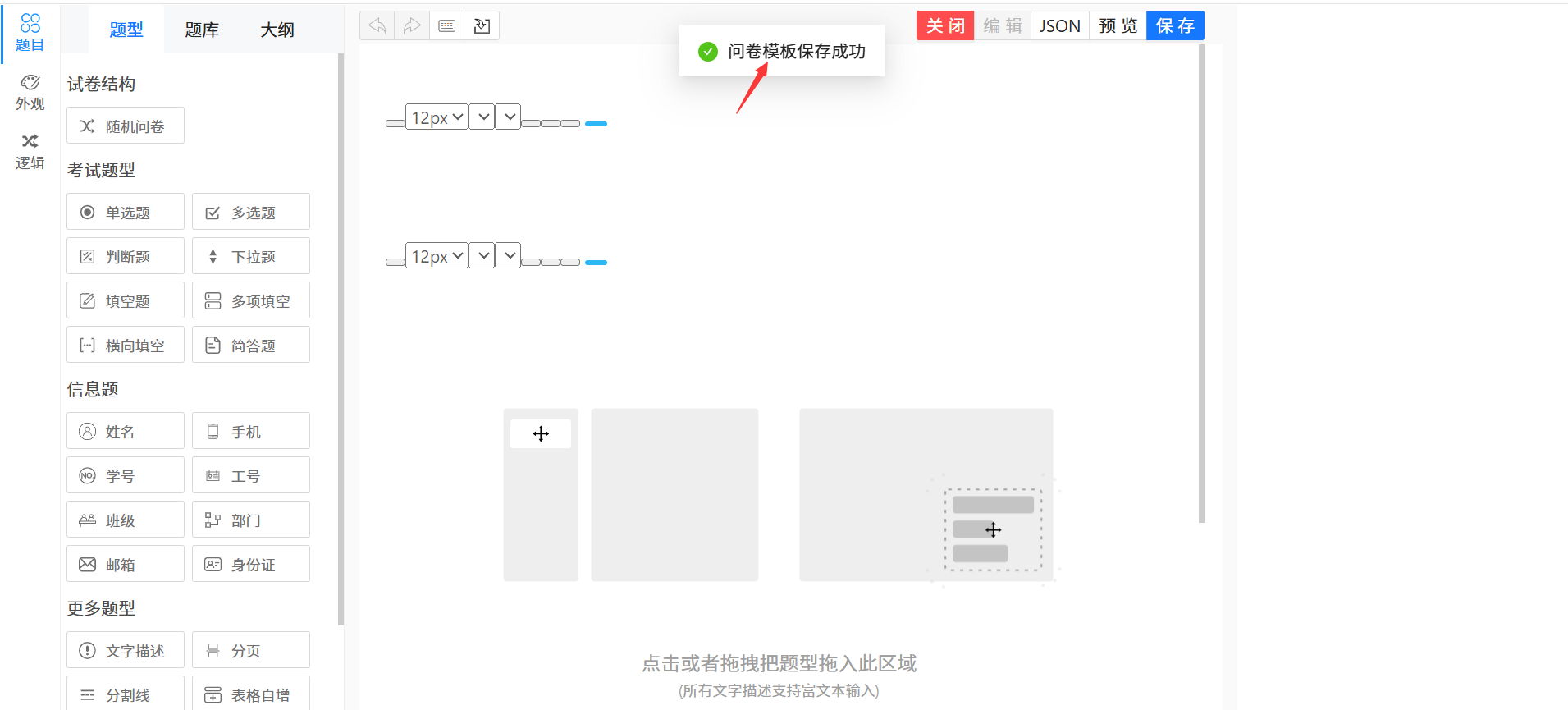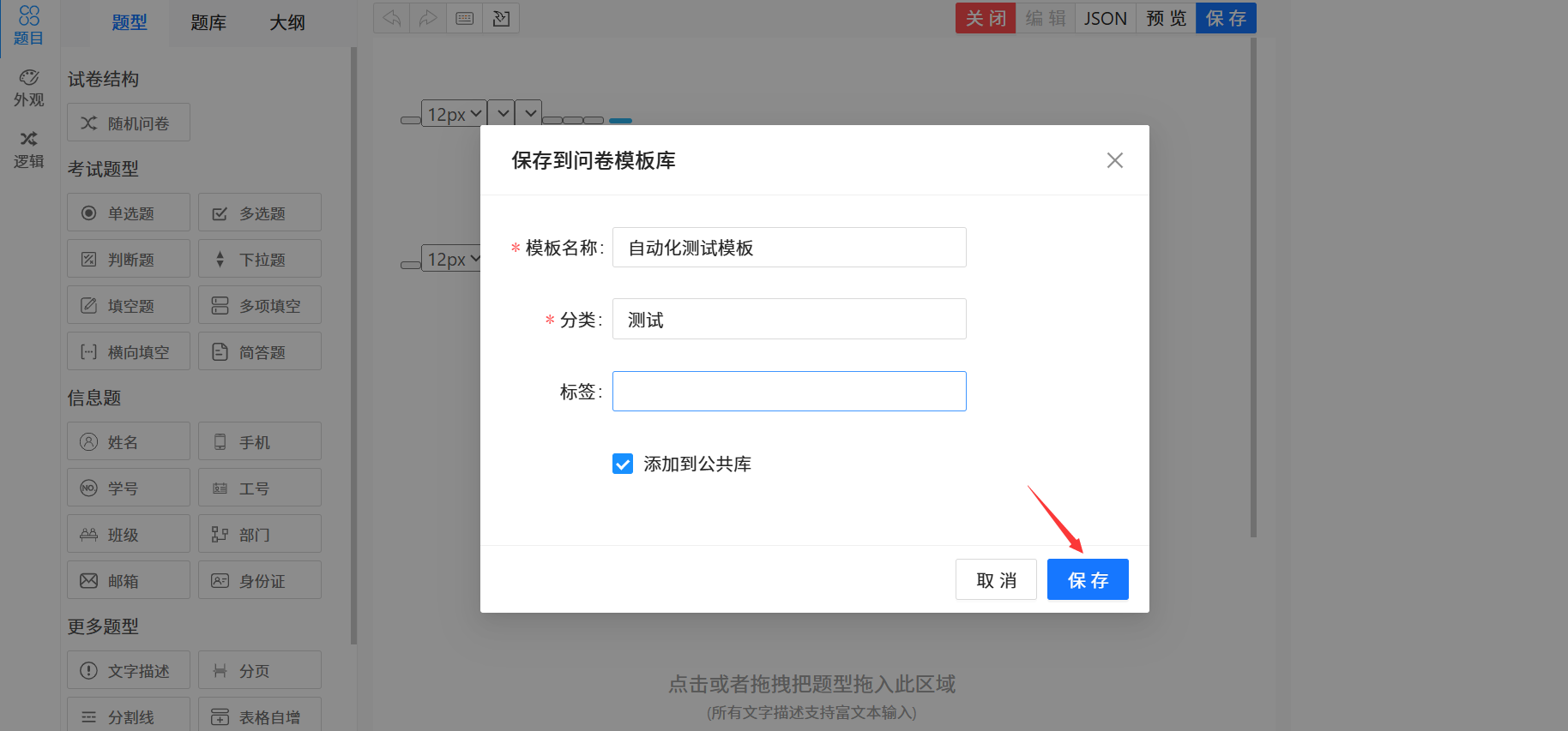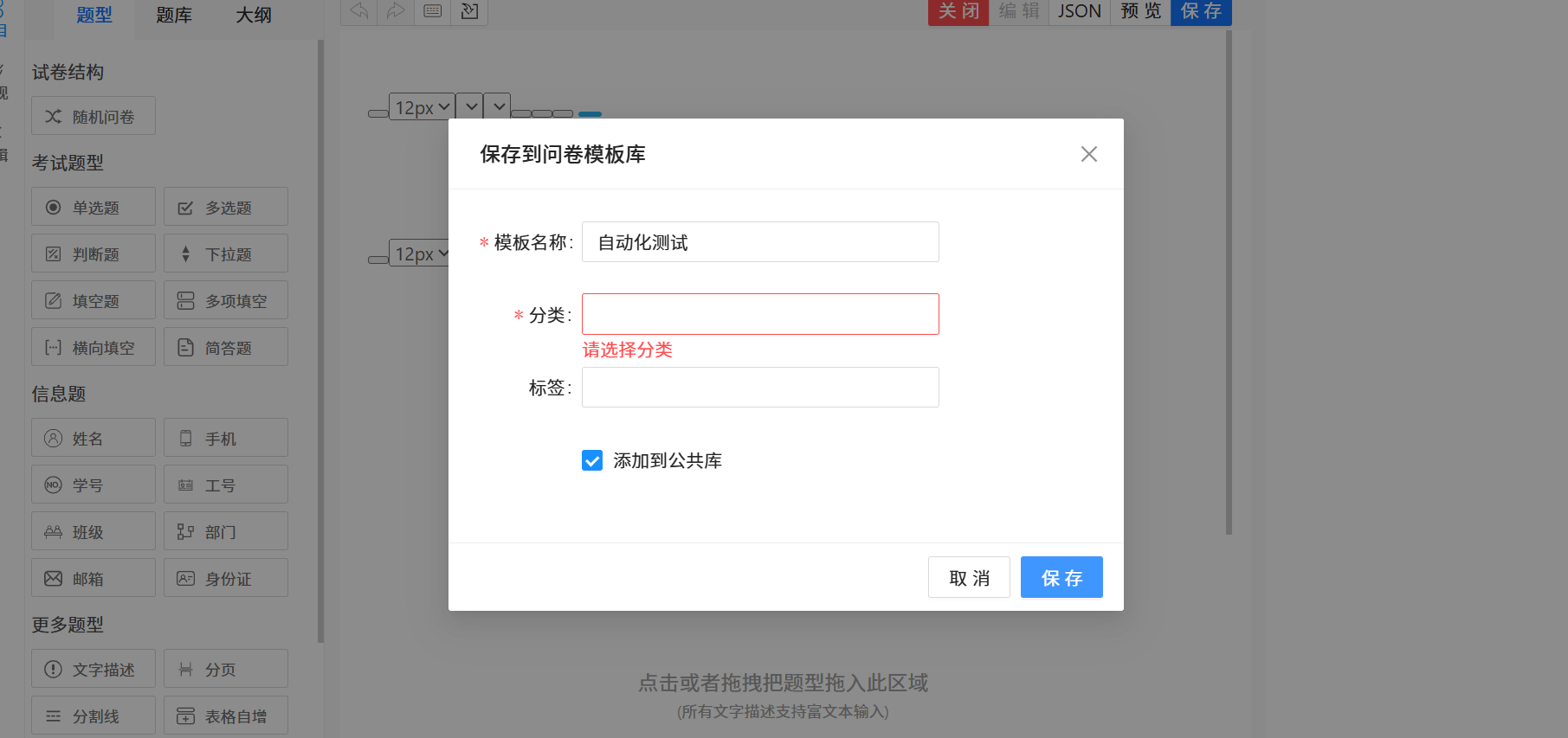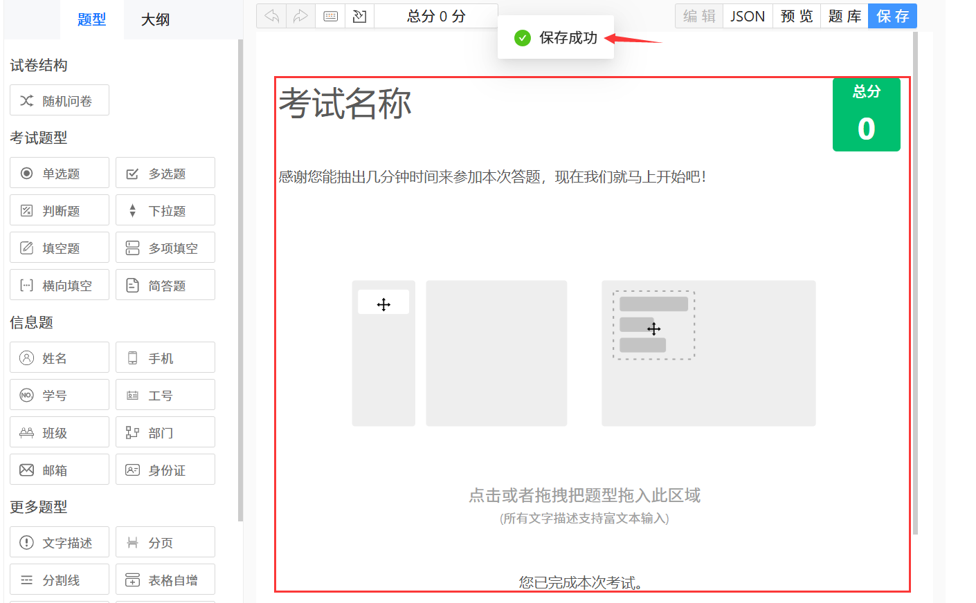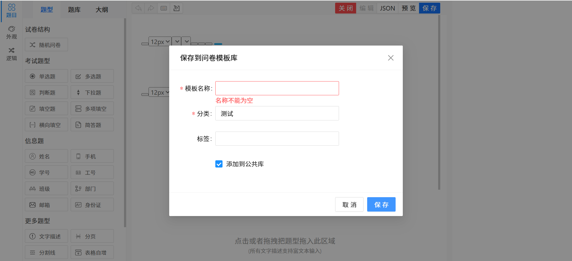 创建问卷/考试异常:没进行编辑,点击“保存”,显示保存成功