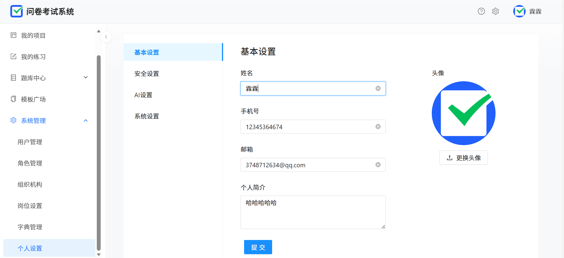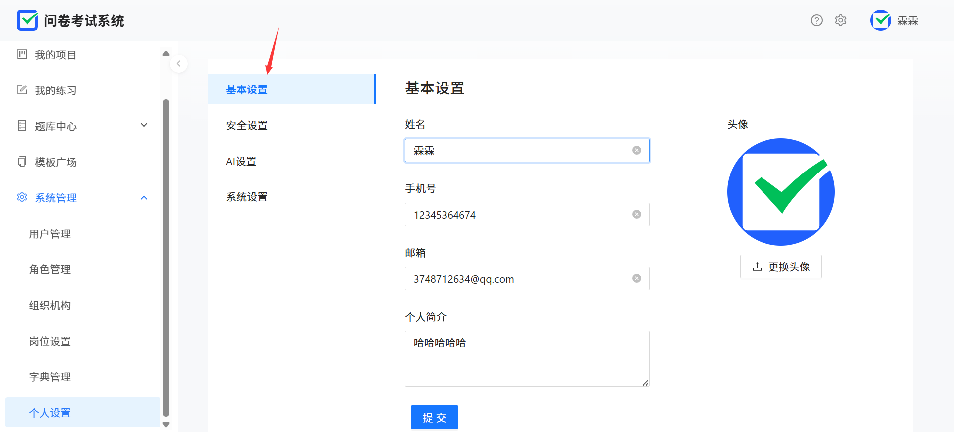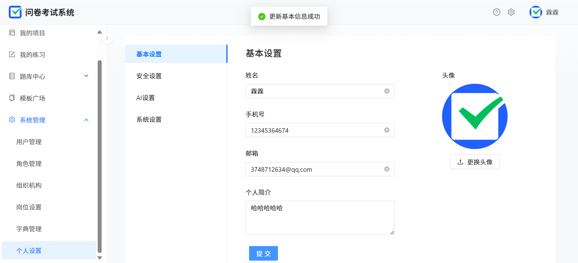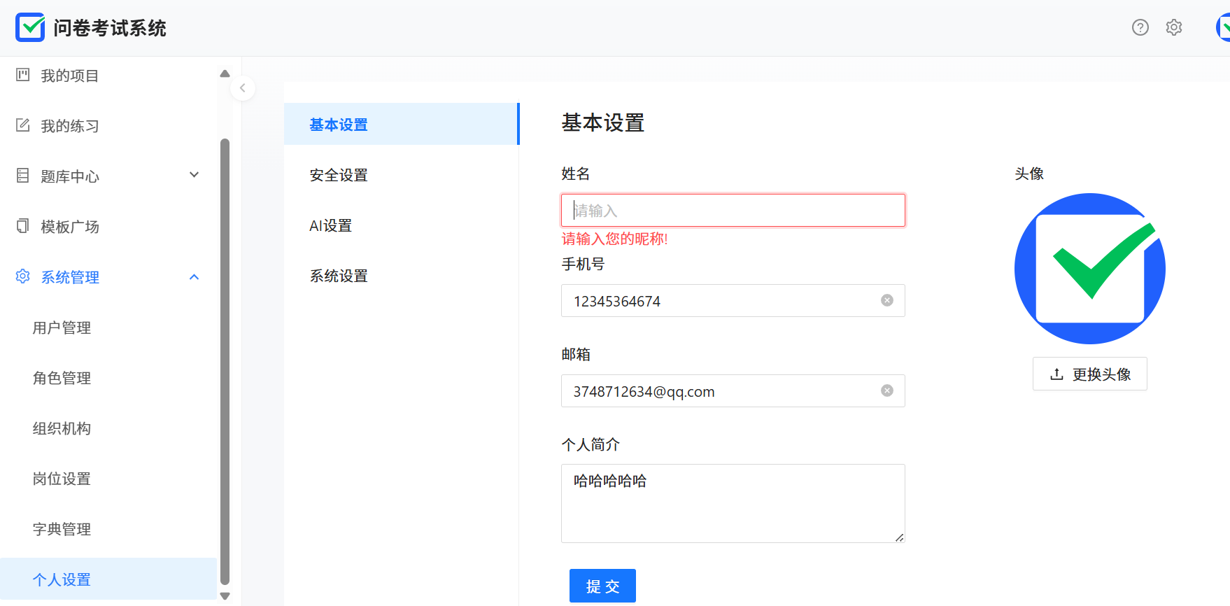 测试场景一:修改姓名、手机号、邮箱、个人简介,点击"提交"按钮