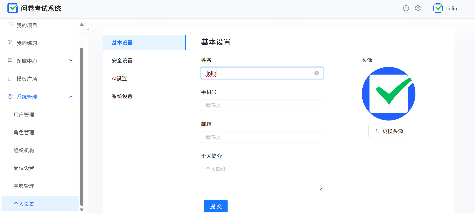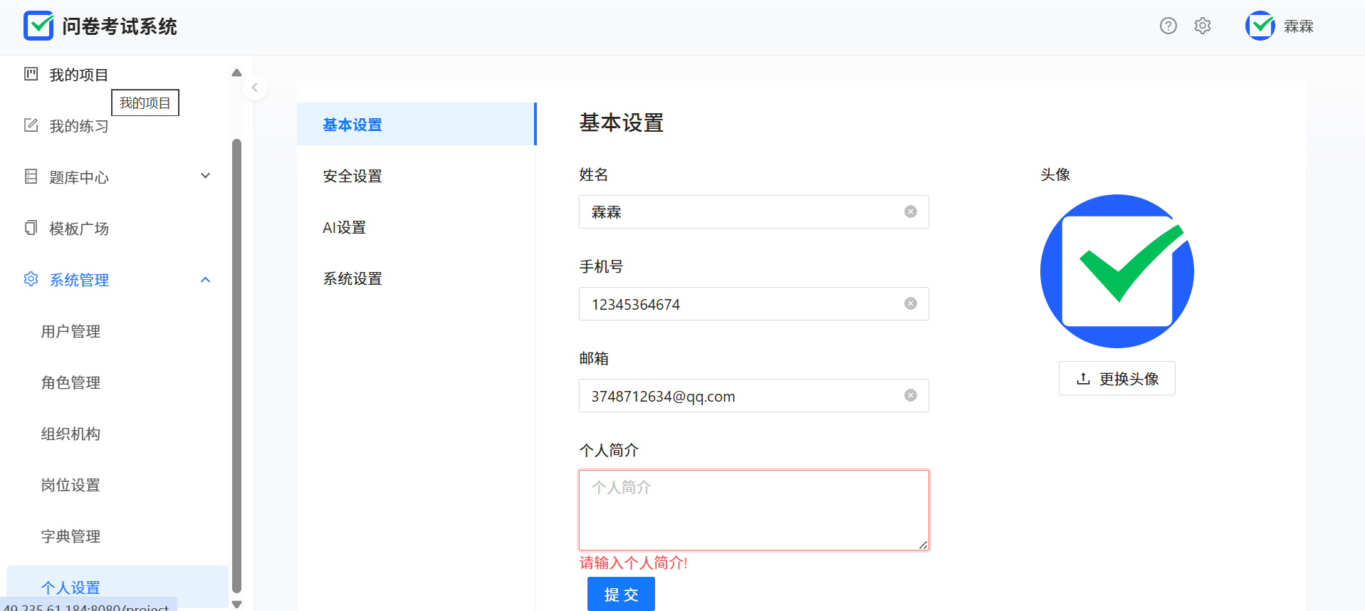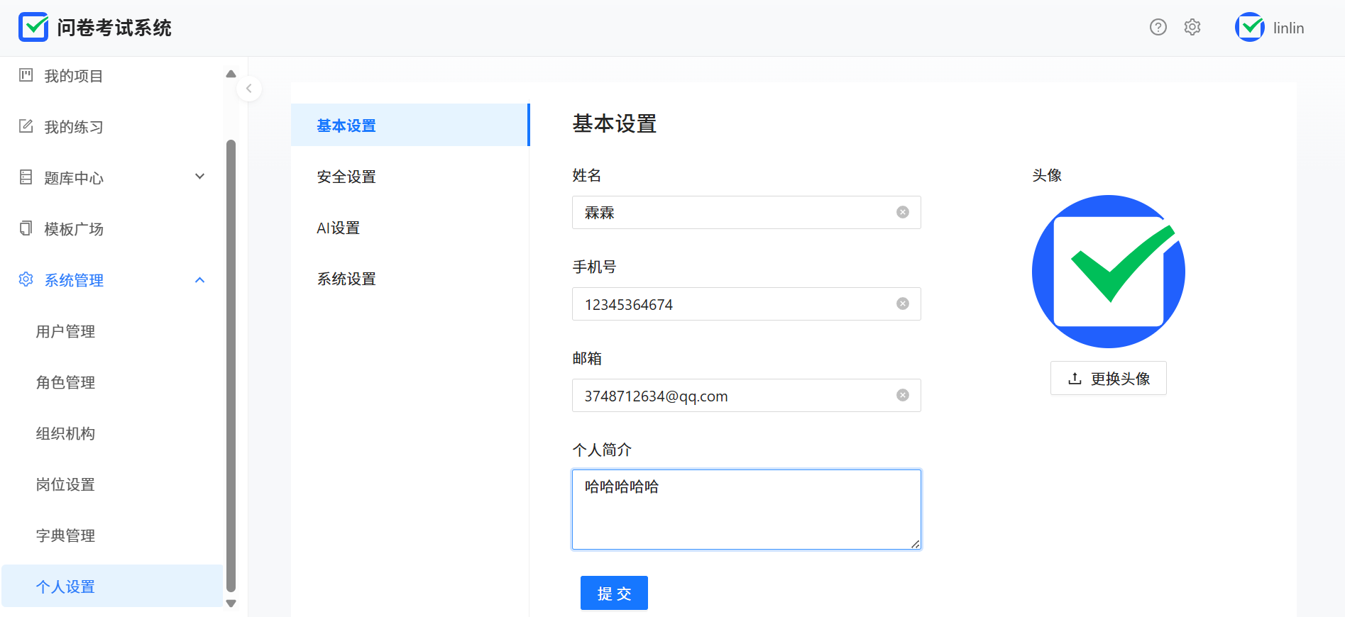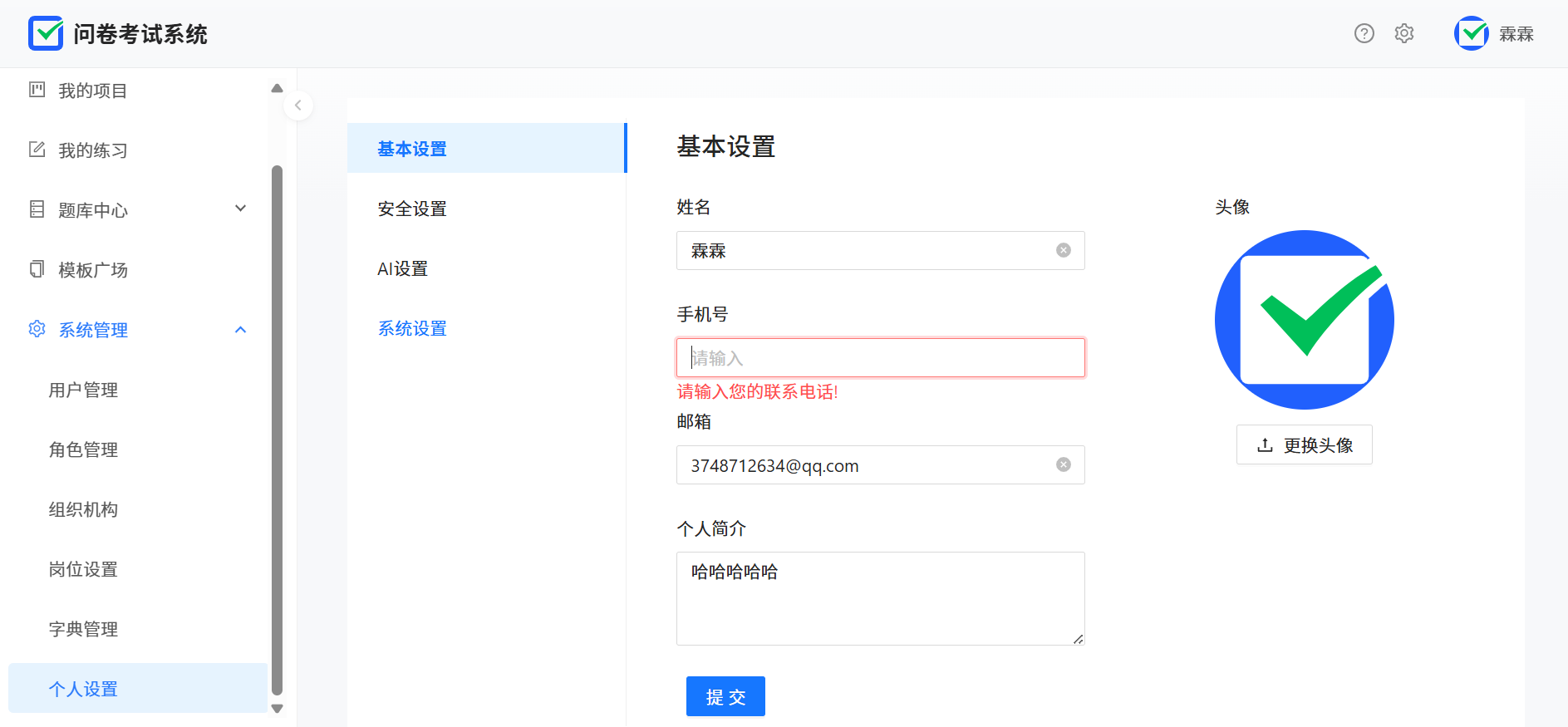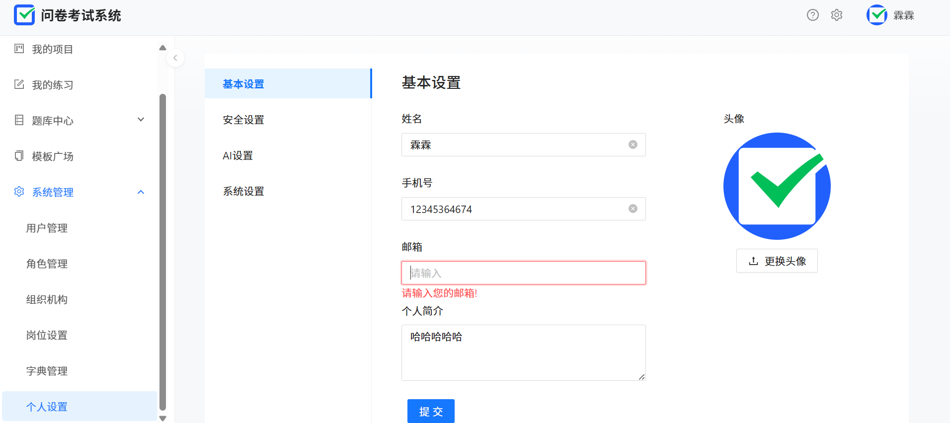 测试场景一:修改姓名、手机号、邮箱、个人简介,点击"提交"按钮