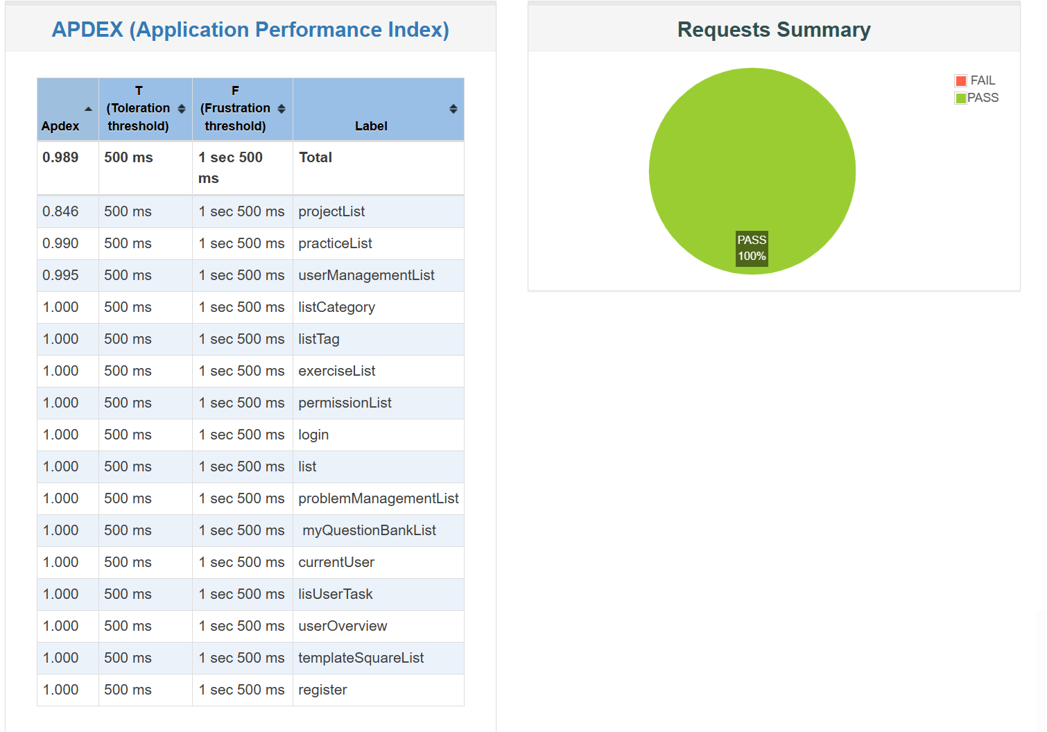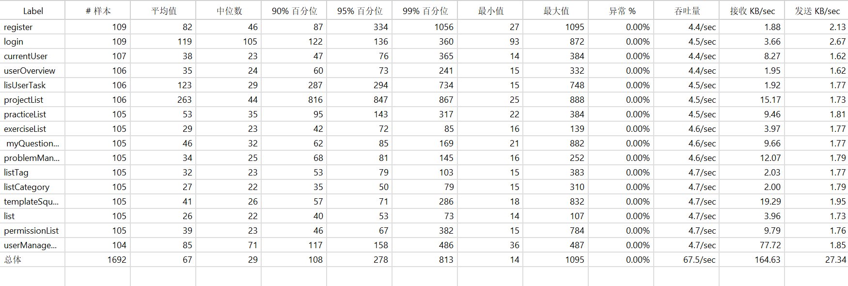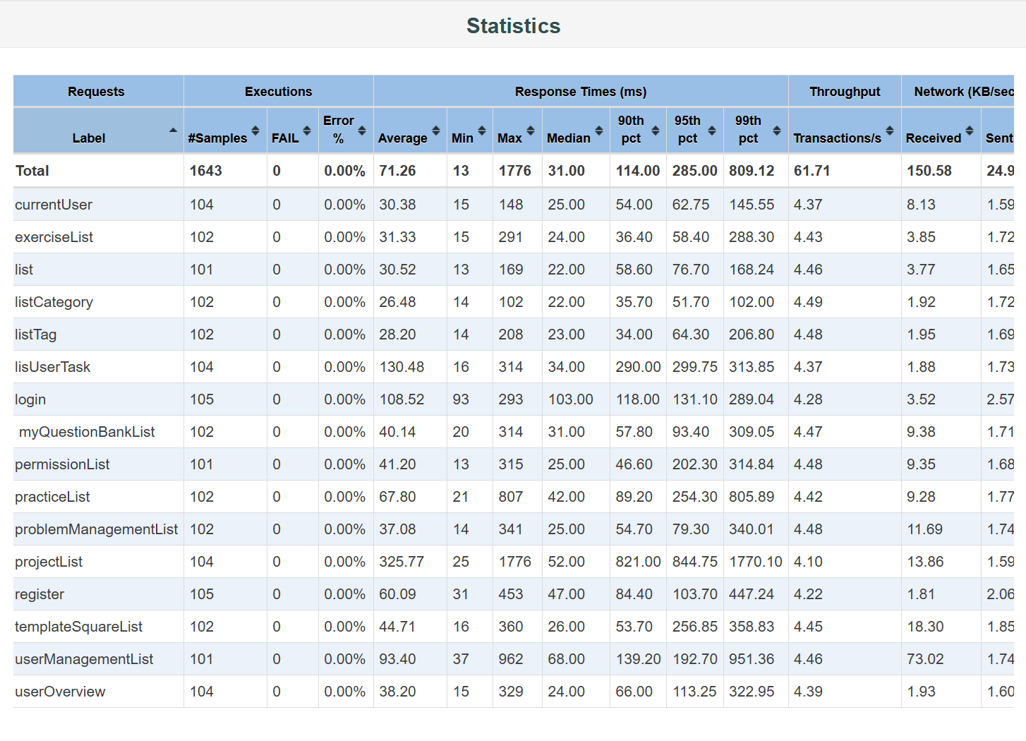 问卷考试系统在性能测试中表现出良好的稳定性与响应效率:核心接口响应时间符合业务预期,吞吐量满足并发处理需求,且无异常请求,系统整体性能达标。