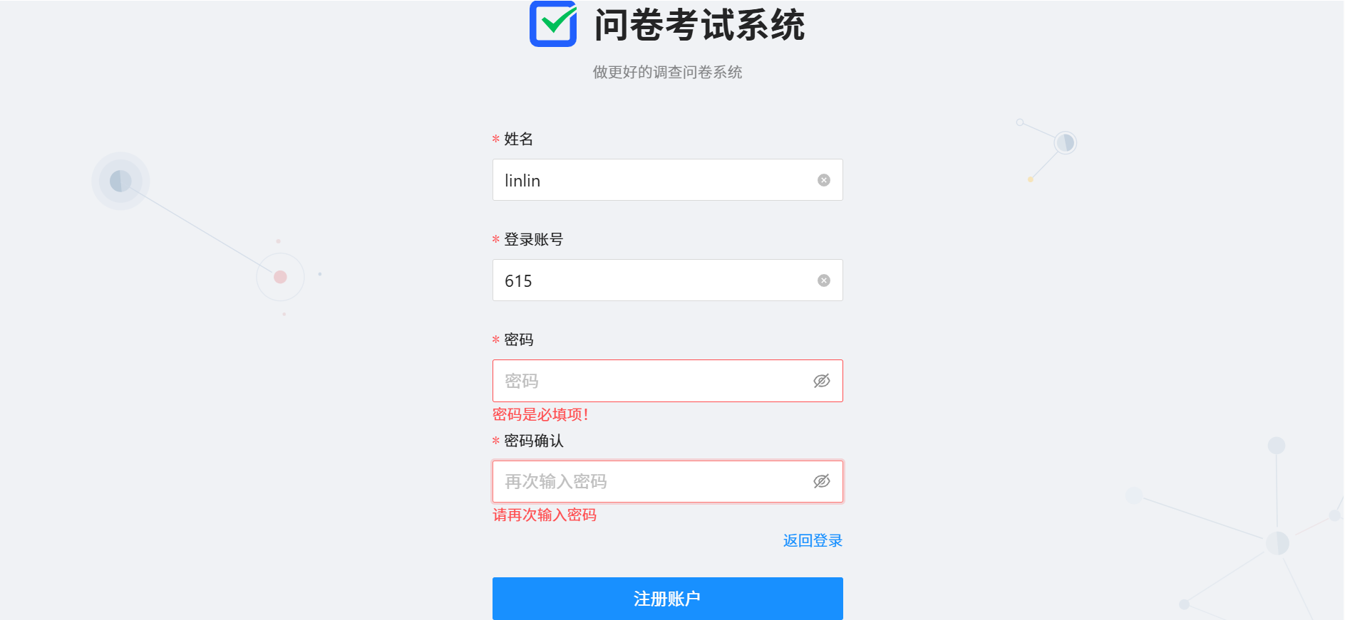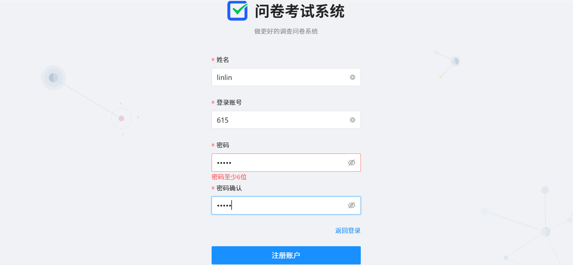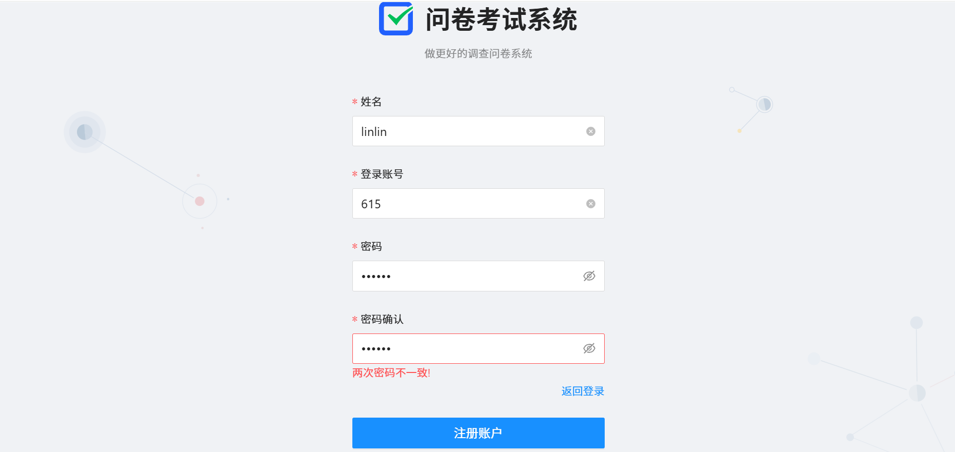 测试场景一:输入正确的姓名、登录账号、密码、密码确认,点击“注册账户”按钮