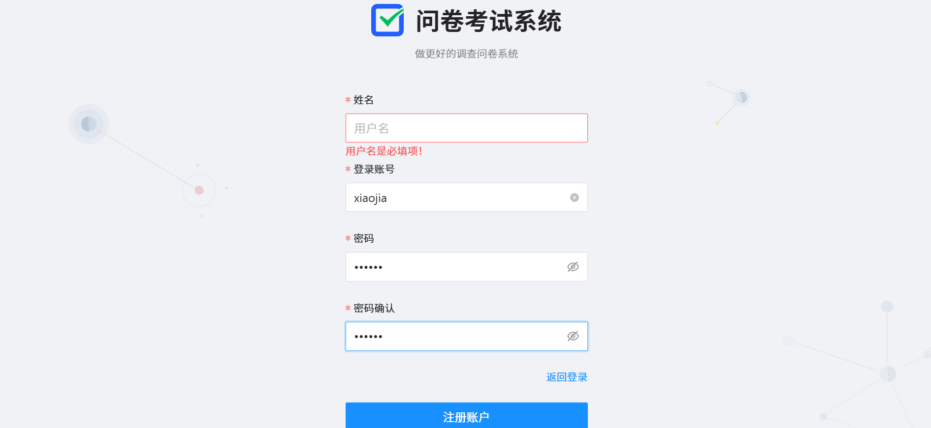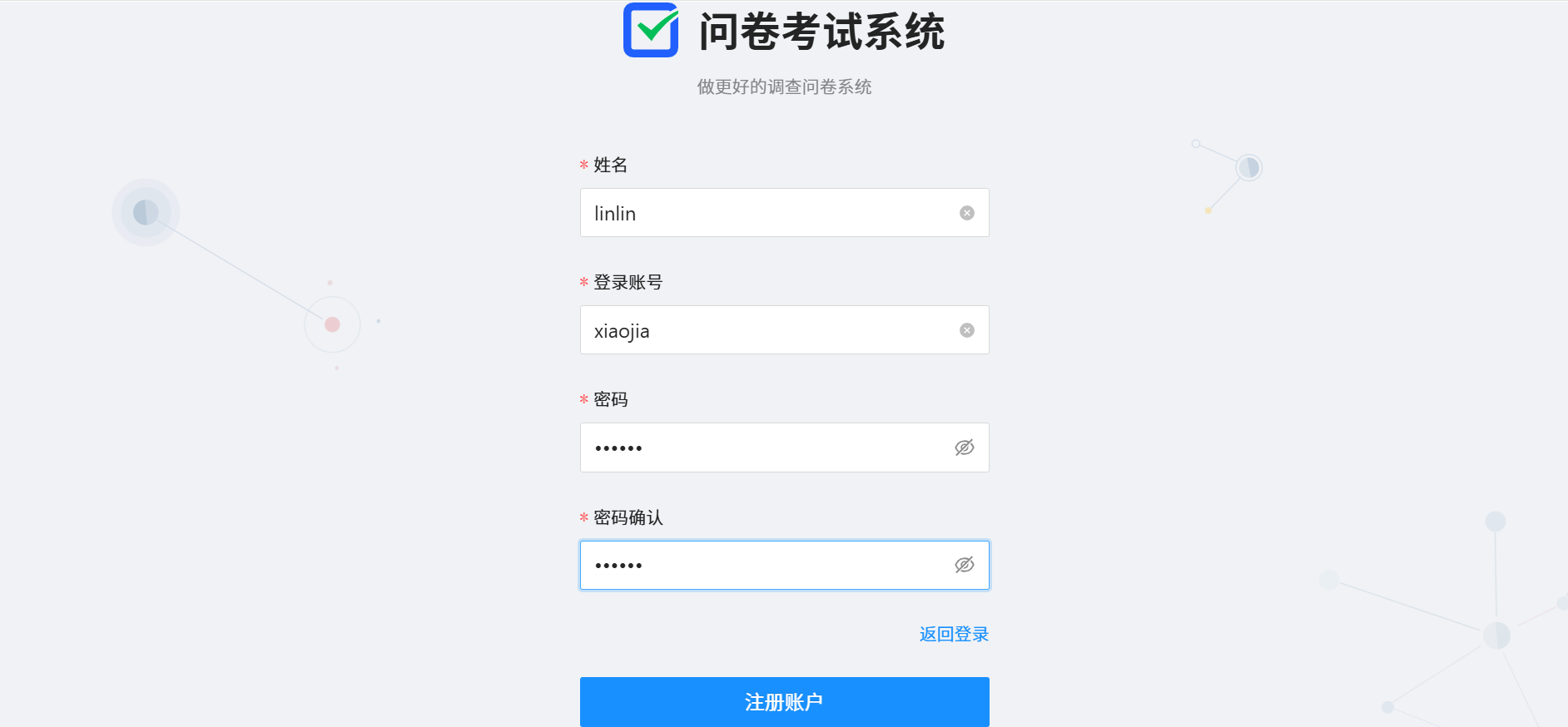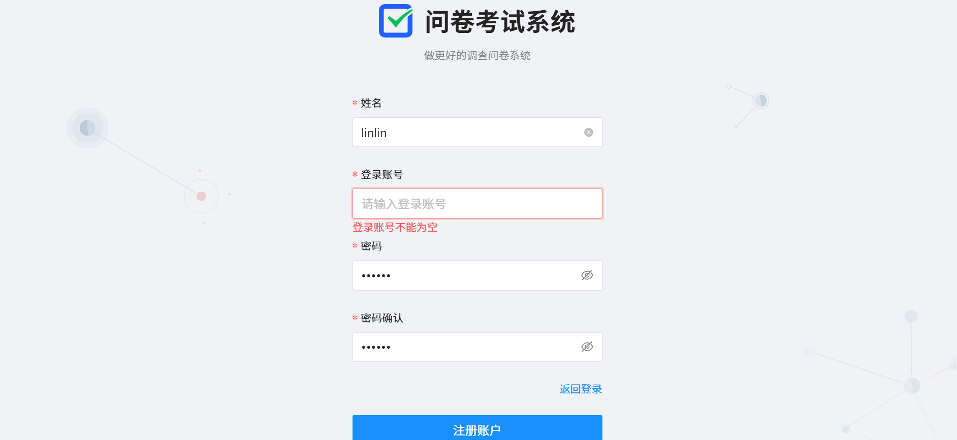 测试场景一:输入正确的姓名、登录账号、密码、密码确认,点击“注册账户”按钮