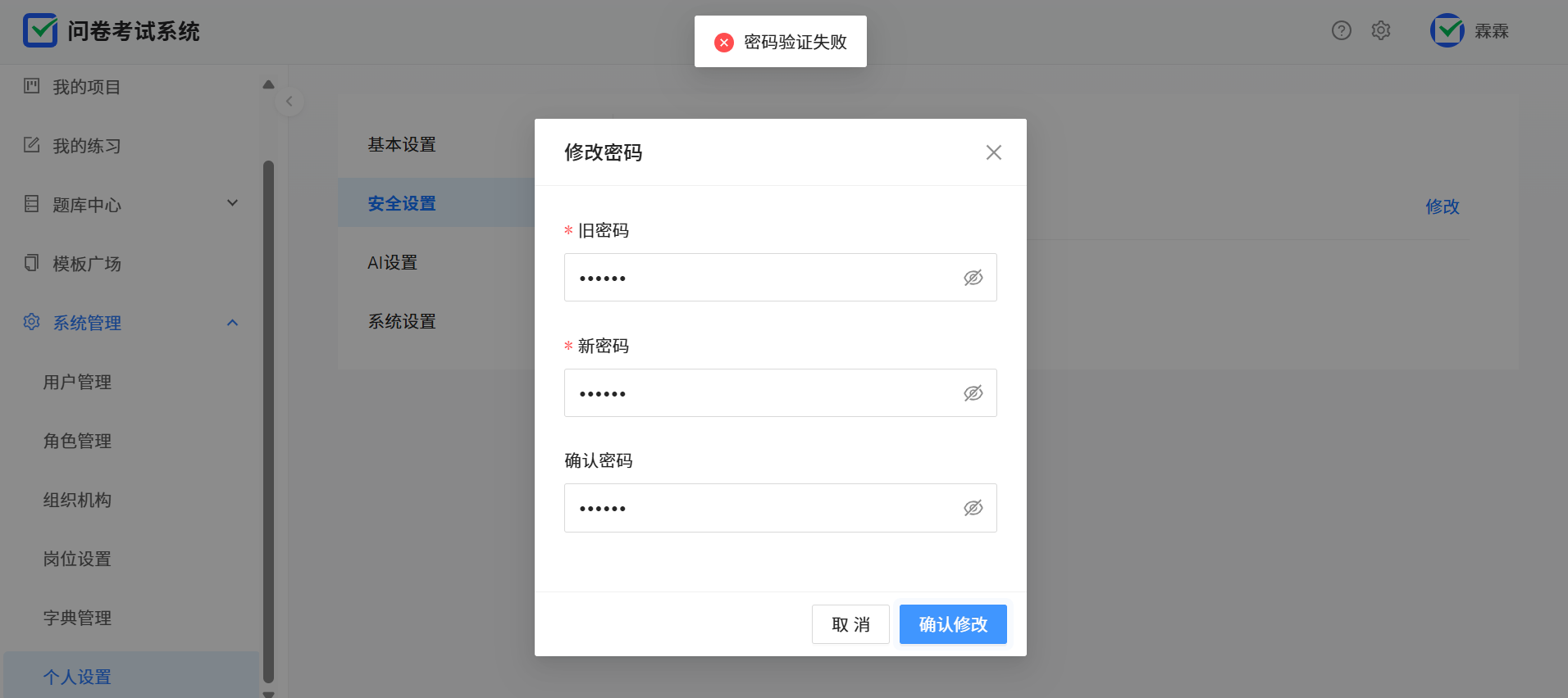测试场景九:输入错误的旧密码、输入正确新密码和确认新密码,点击“确认修改”按钮