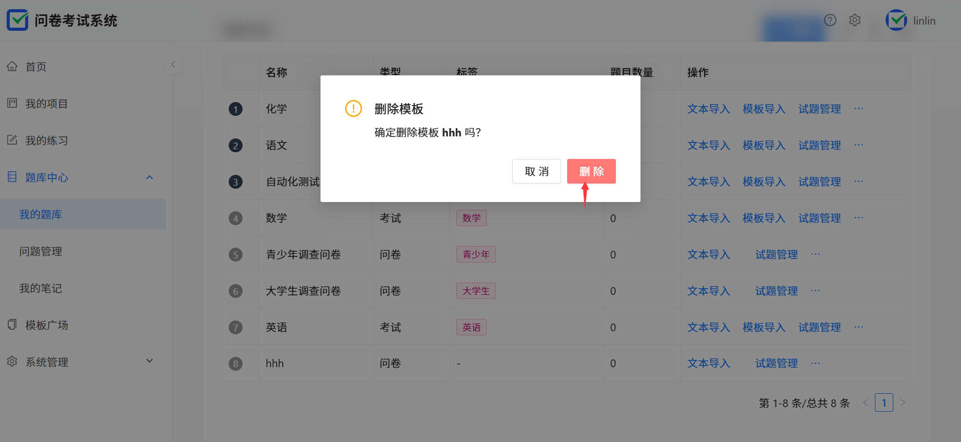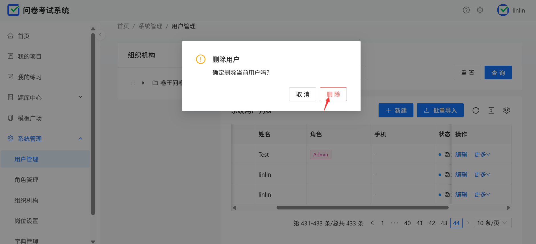 测试场景十二:点击“删除用户”按钮后,点击删除用户弹窗中的“删除”按钮