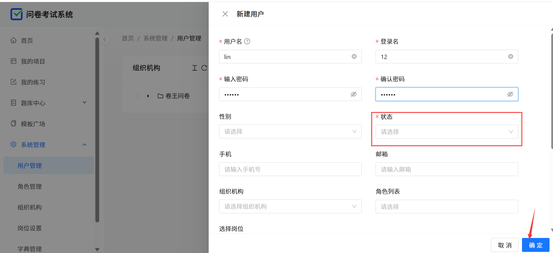 测试场景九:在新建用户弹窗中,状态未选择,其他正常输入,点击“确定”按钮