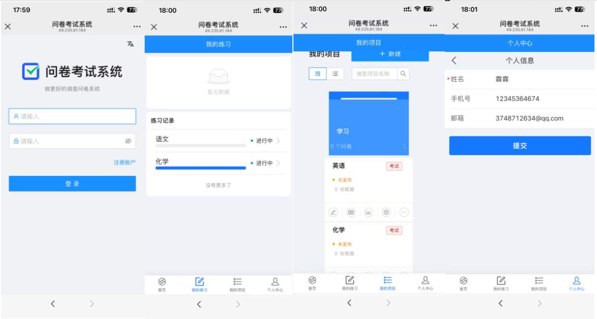 问卷考试系统的主功能没有问题,可以在不同的浏览器、设备、操作系统中正常运行和使用。但有些地方需要优化比如:我的项目页面中“保存”按钮异常问题、我的题库页面中“文本导入”中的异常问题、模板广场页面中的“搜模板”按钮异常问题、用户管理页面新建用户中状态选择框、重置密码的异常问题以及个人设置页面的修改密码的异常问题。