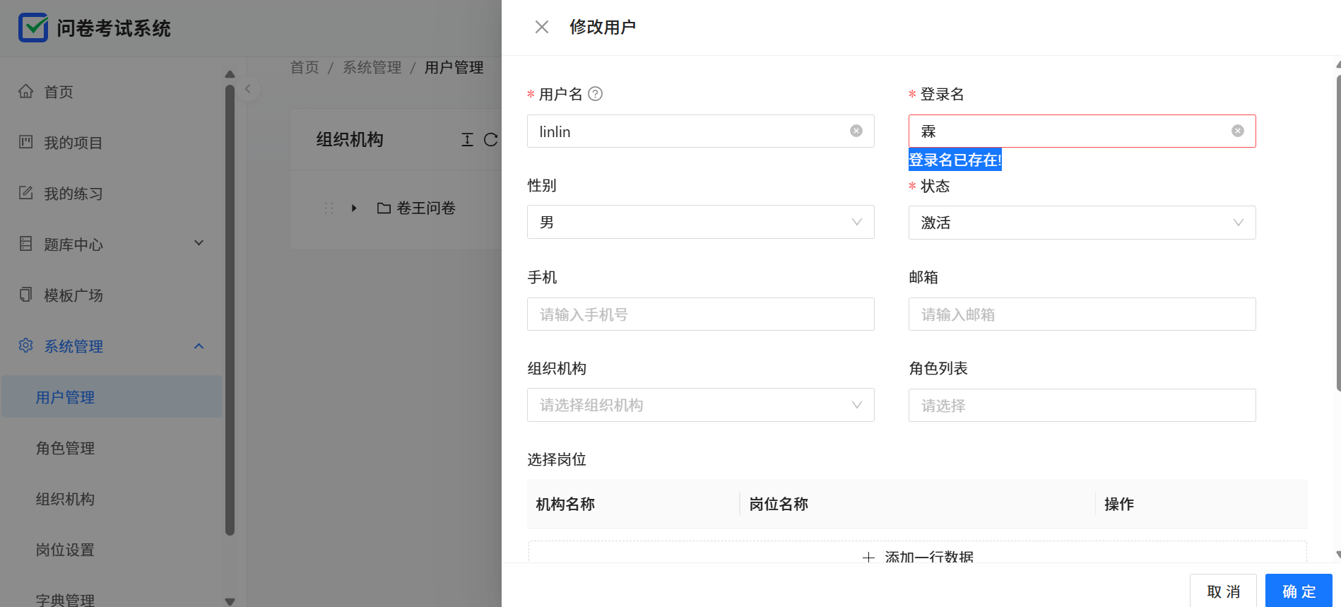 测试场景十:点击操作中的编辑按钮,修改成已存在的登录名,点击“确定”按钮