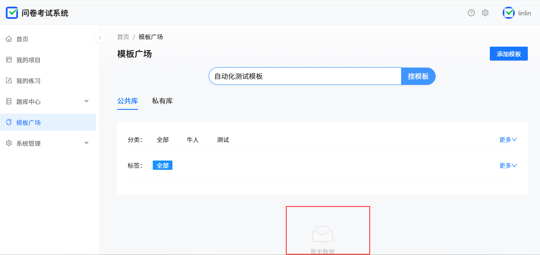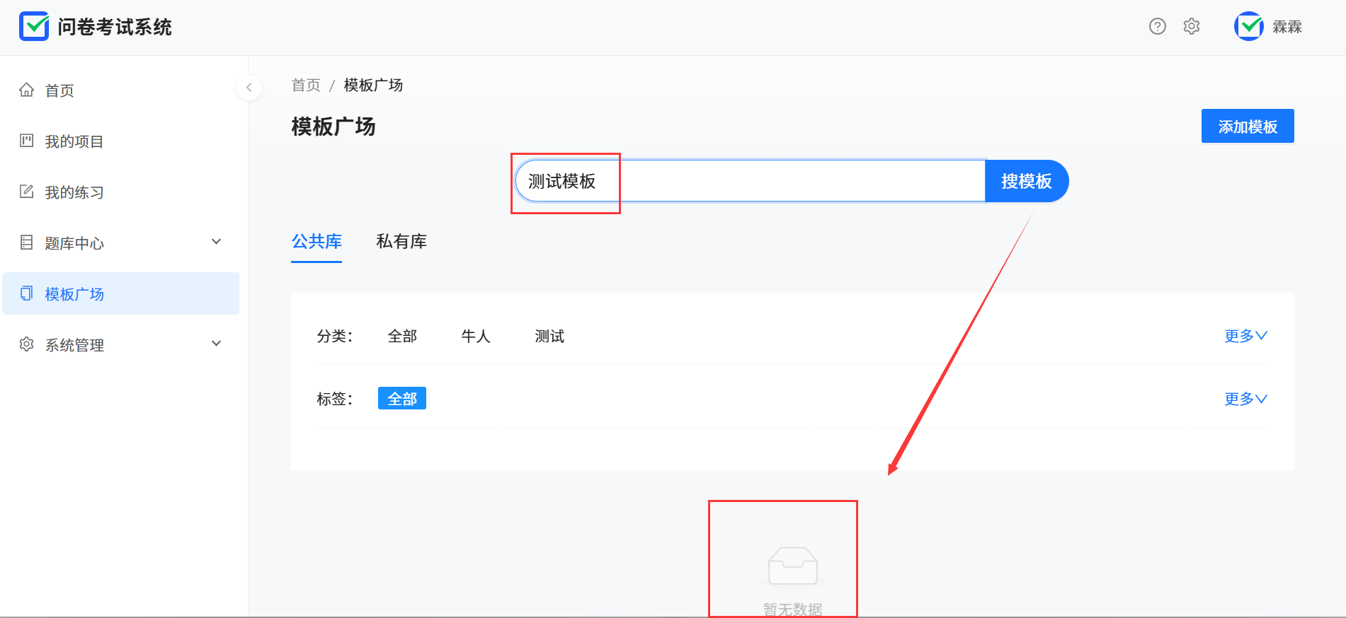 “搜模板”按钮异常:输入已存在的模板,点击“搜模板”按钮,显示暂无数据