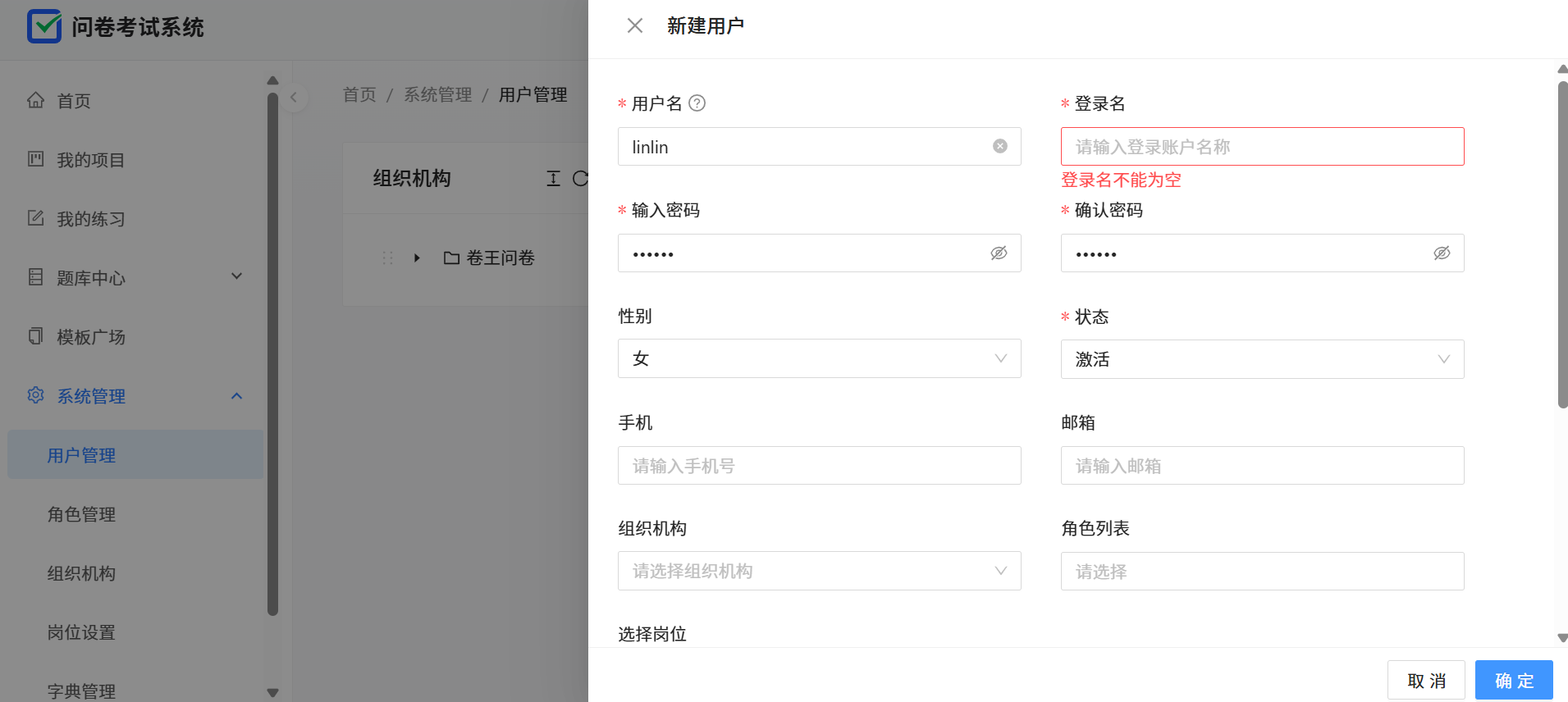 测试场景六:在新建用户弹窗中,输入已存在的登录名,其他正常输入,点击“确定”按钮