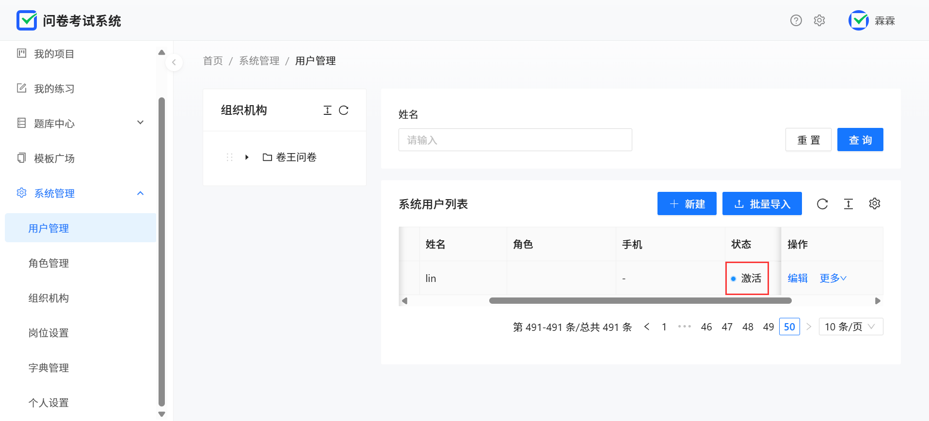 实际结果:未选择状态,新建用户成功,在系统用户列表中显示这个用户的信息
