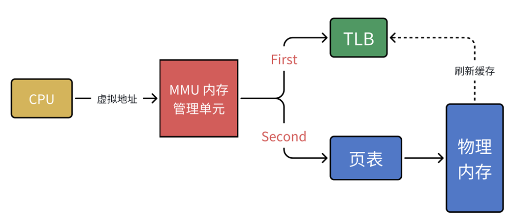 CPU 向 MMU 发送新的虚拟地址后,MMU 首先查询 TLB 是否存在对应的映射记录。如果命中(Cache Hit),则直接获取物理地址并发送到内存总线,完成寻址。