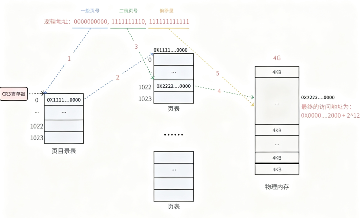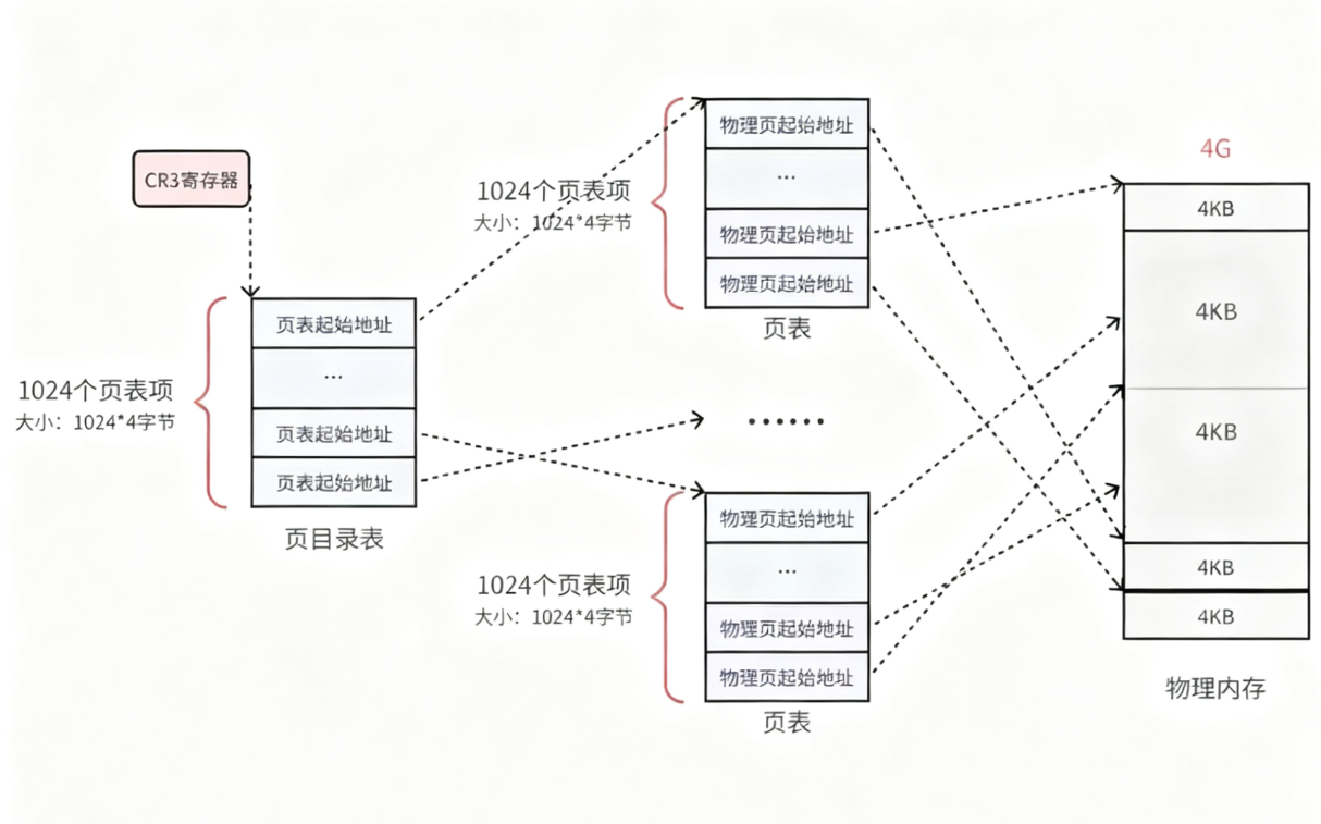 目前,每个页框都通过页表中的一个表项进行映射。为有效管理这1024个页表,系统引入了页目录表,从而形成二级页表结构,如下图所示: