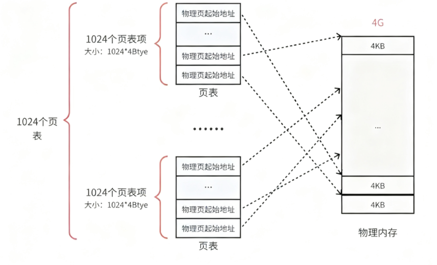 为解决此问题,可将单个页表拆分为1024个规模更小的映射表。如图所示,通过1024(单个表的表项数量)×1024(表总数)的设计,依然能够完整覆盖4GB物理内存空间。