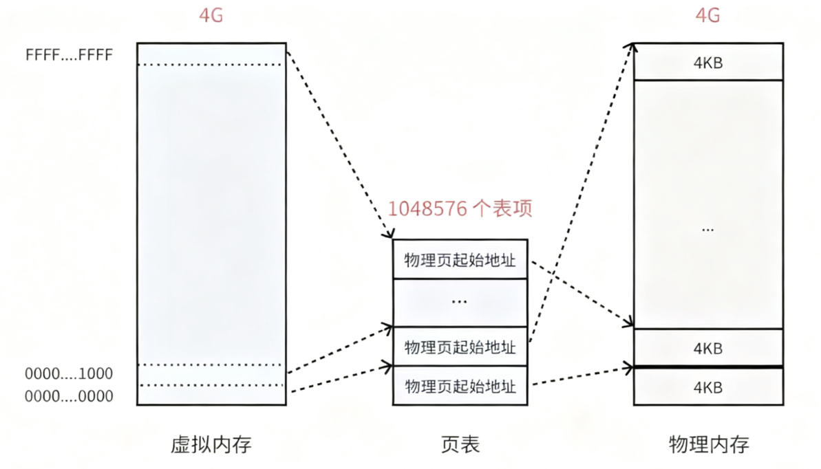 页表中的每个表项都指向一个物理页的起始地址。在32位系统中,每个用户程序都拥有4GB的虚拟内存空间。要使整个4GB虚拟内存空间都可访问,页表需要包含4GB/4KB=1,048,576个表项。如下图所示: